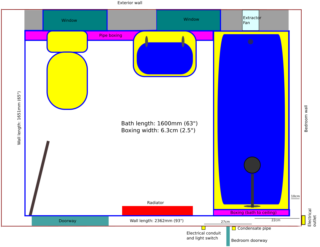 My husband is worried that my boxing idea would put the plumbing too close to the electrical stuff on the other side of the walls. There is some surface mounted conduit and a light switch on the wall in the hallway, and a wall-mounted outlet near the floor in the bedroom on the other. I made a quick scaled drawing to show my idea. The distance between the approximate place where the plumbing would go and the conduit is 22cm, and to the outlet is 27cm. The existing wall between the bath and the outlet is approximately 10cm thick.