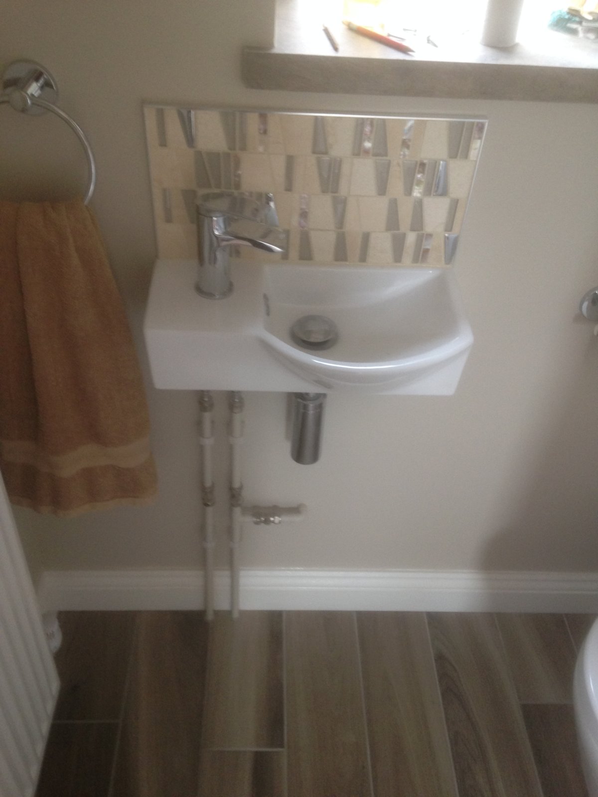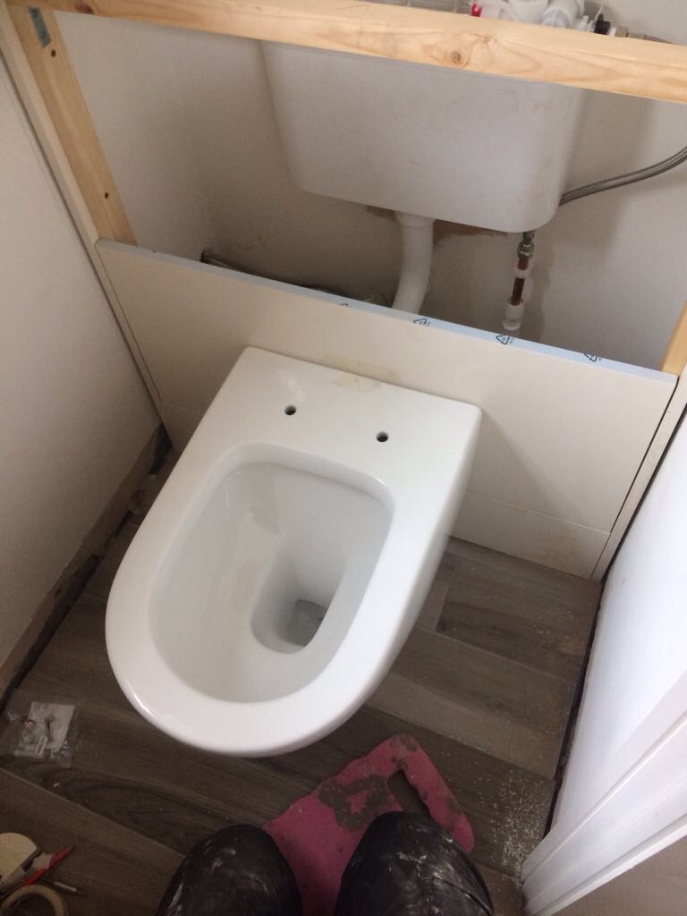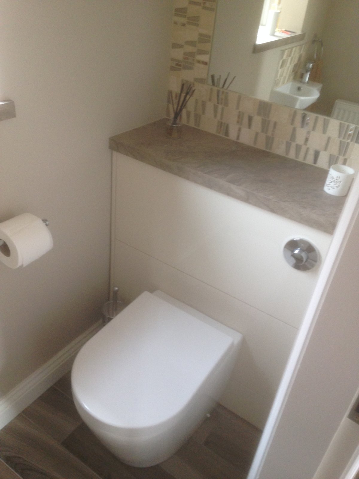 Downstairs cloakroom refitted using pan drawer fronts from howdens to box in concealed cistern with Keku clips for easy removal. Half height cupboard above toilet and inset mirror.
