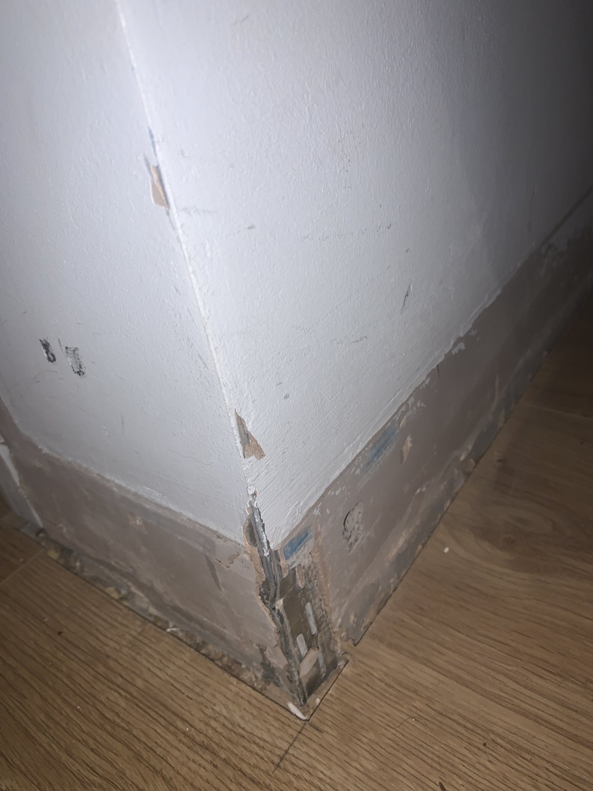 We recently removed l skirting board for a new laminate floor, I have yet to add new skirting but I have noticed draughts coming from the chipped plasterboard on wall corners, in some places exposing the metal mesh underneath, please note picture b