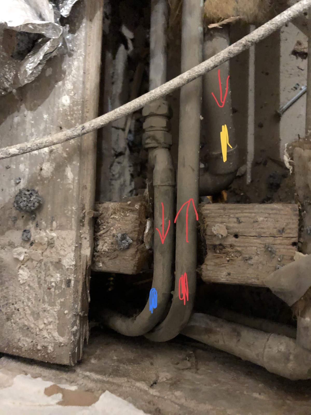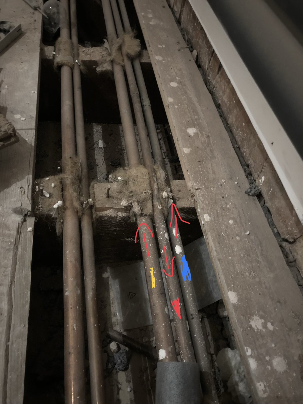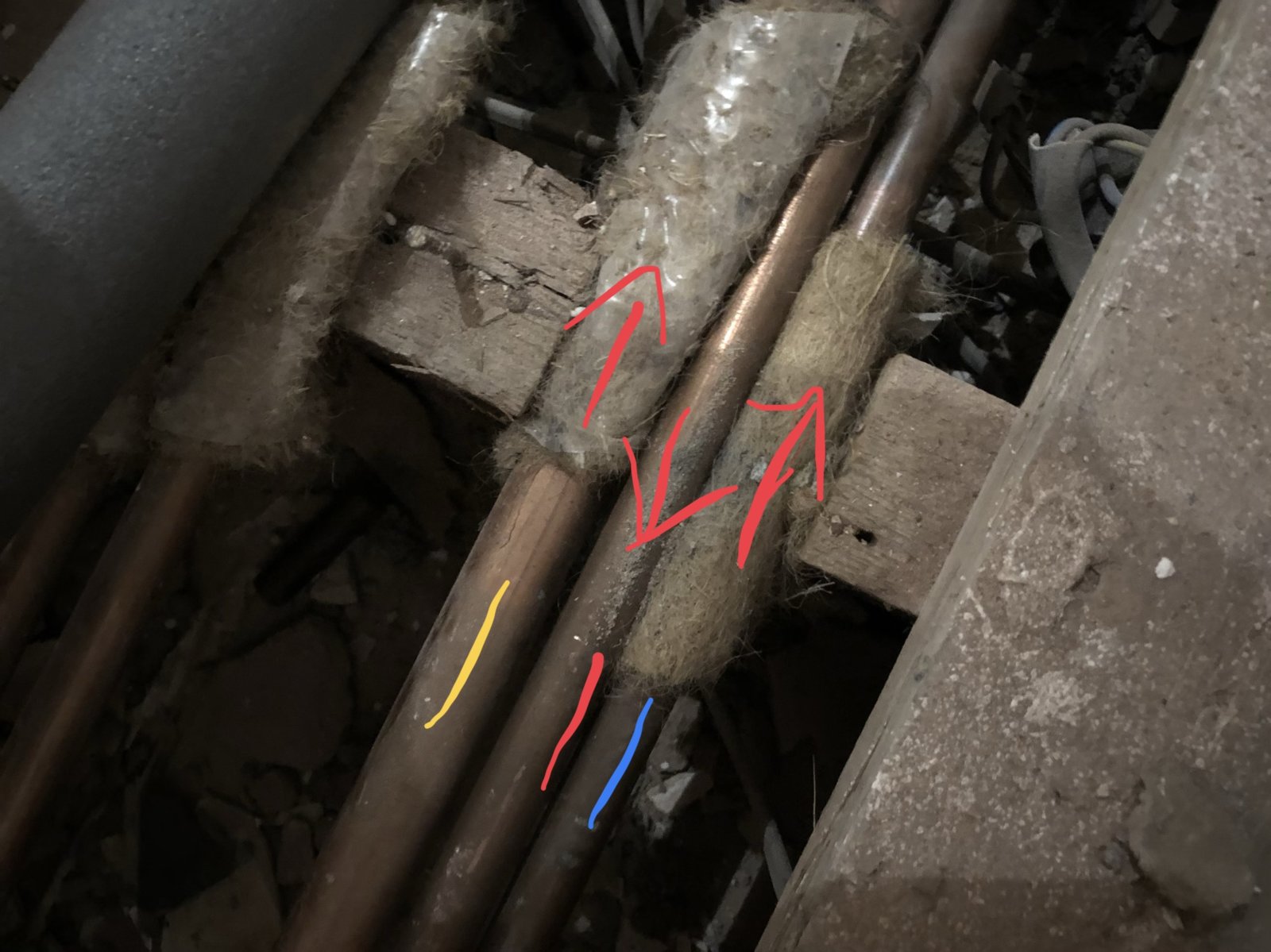 Hi, please see attached photos (blue: cold mains to boiler and kitchen after bathroom. Red: hot from boiler to bathroom. Yellow: gas to boiler. The other pipes are the radiator pipes that do run across under the pipes at the radiator ends - again too close to them) is this okay? I’m concerned that the hot and cold pipes are too close to each other and I’m aware it’s not recommended, although they are separated by that mysterious material (to me) above the joists but it doesn’t look satisfactory. It runs like that for 3m and then down to the boiler and kitchen.