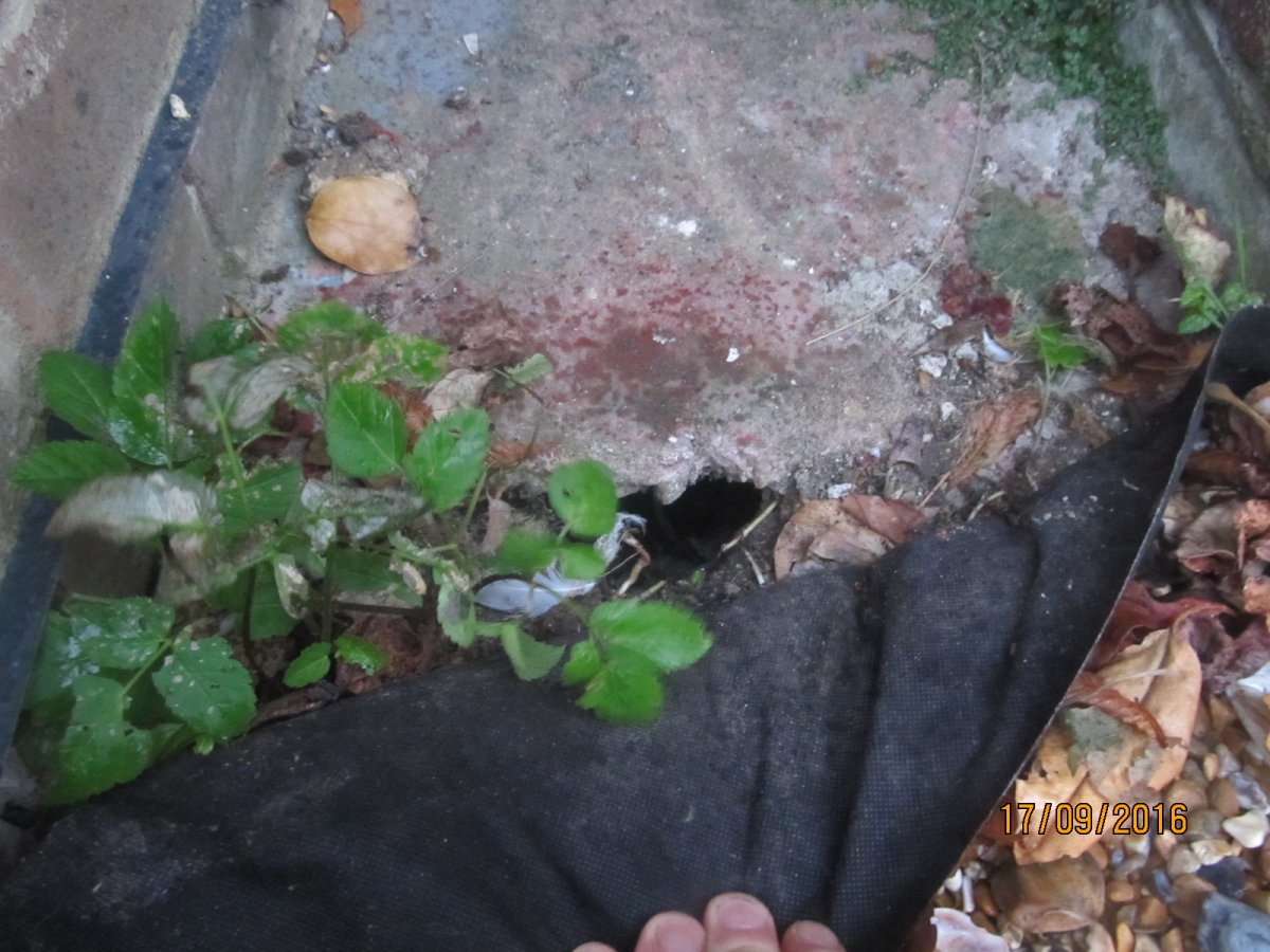 Q - Have rats been an issue? A: There are a lot of rats around this area since we back onto an overgrown railway sidings. I have seen rats in the back garden, but I haven't seen them at the front or in this specific hole. I did notice recently that some of the black lining we mentioned had been nibbled at a couple of metres away, so it is a possibility.
