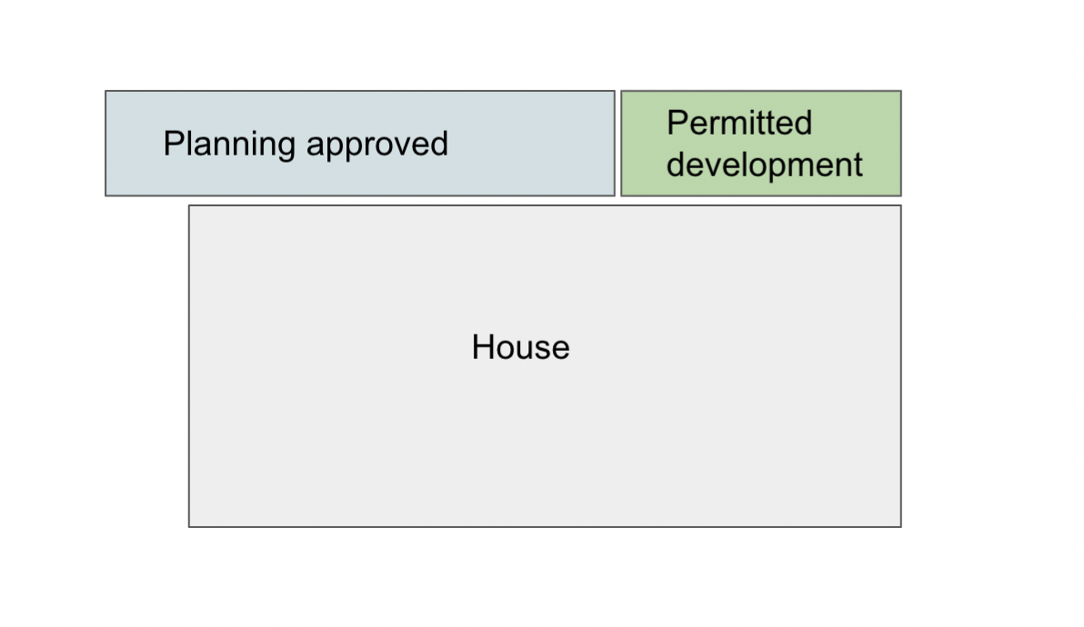 2. we were advised to then apply for permitted development for the section in green. It is well within the 50% house width limit as so we would get it granted, which it was