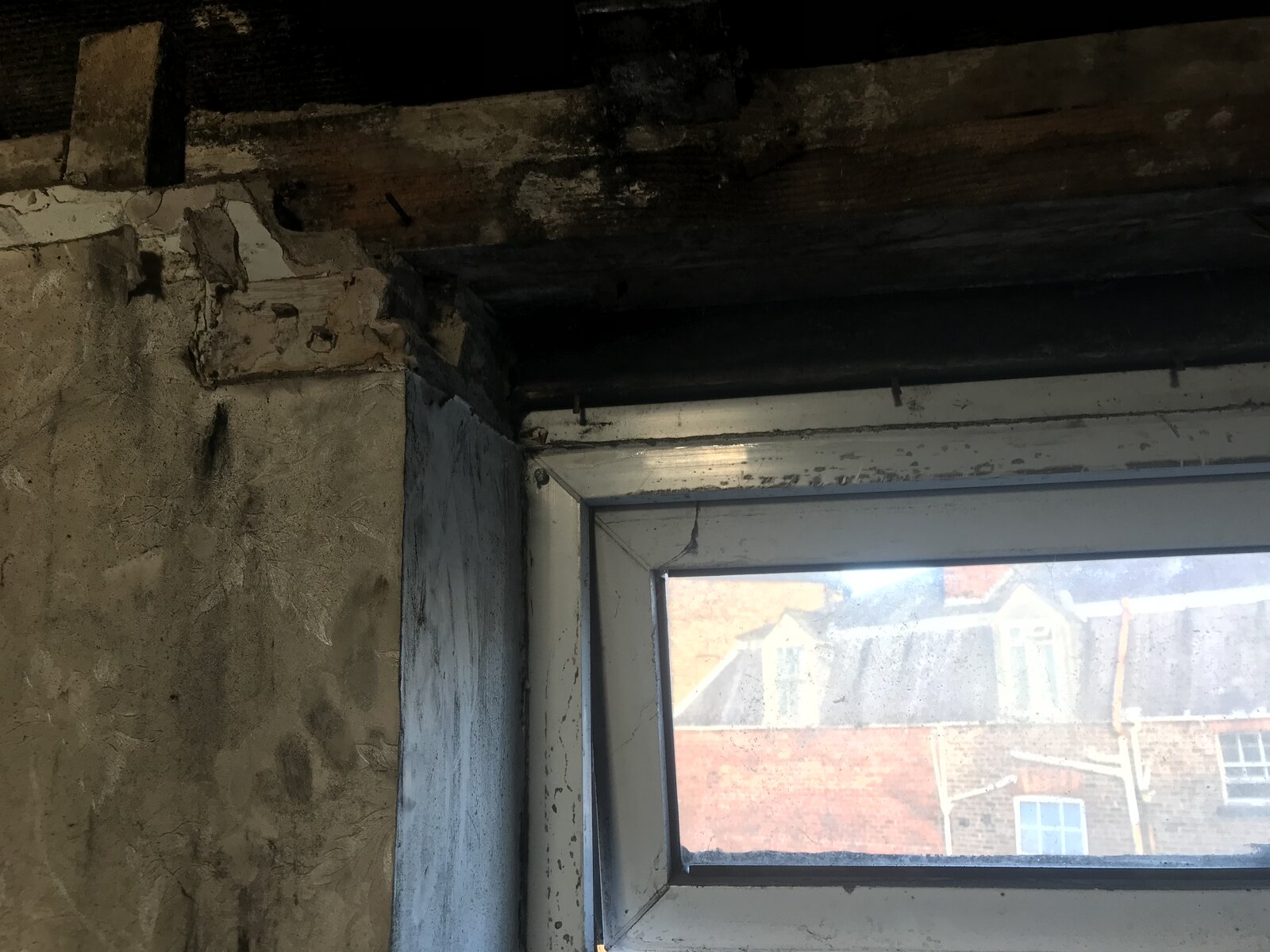 After stripping out the plaster board i removed a piece of 2 x 2" which was a packer to make good for the plaster board on the underside. Effectively the wall plate is acting as the lintel. There is an external wood lintel which you can see above the window.