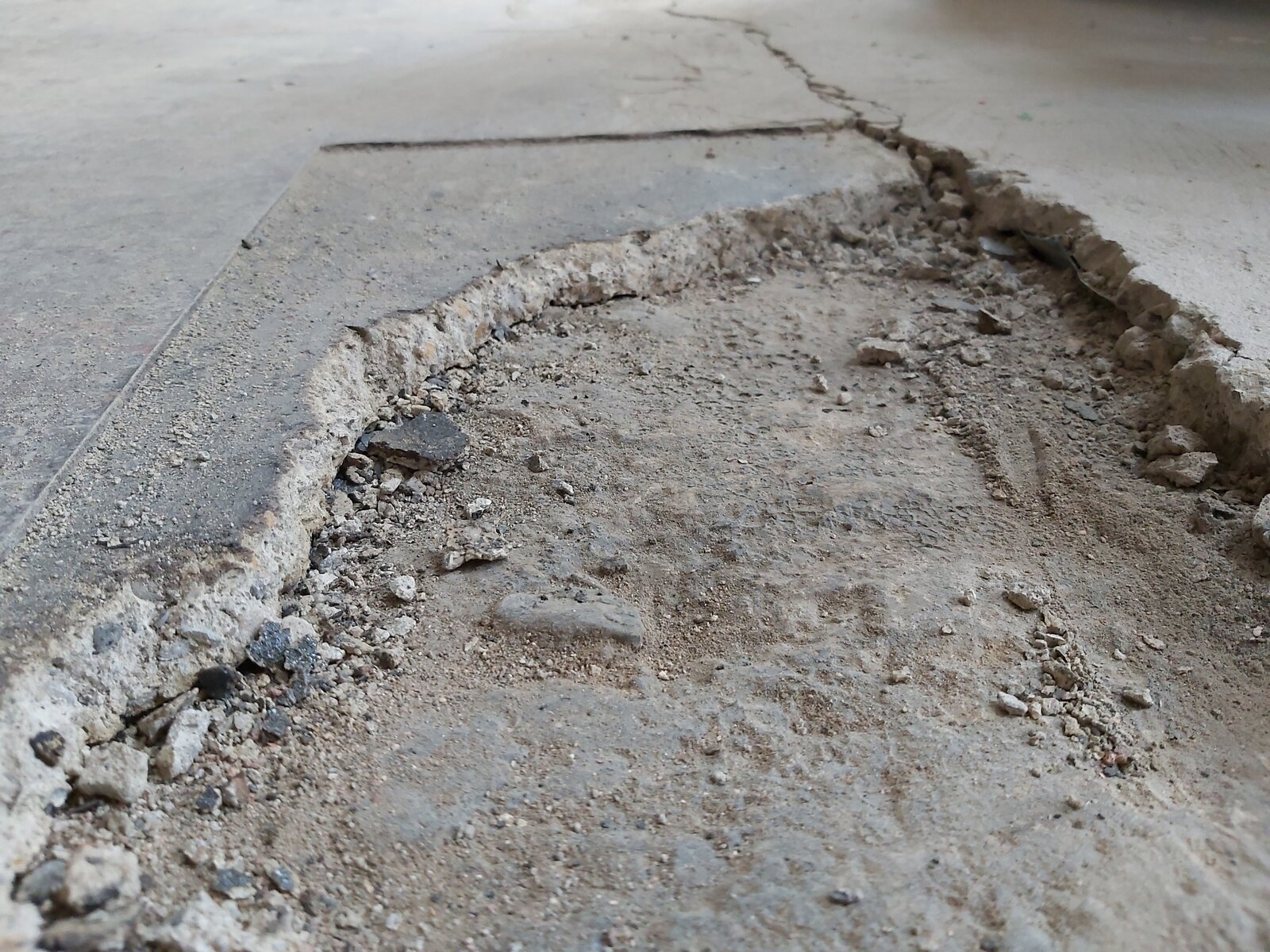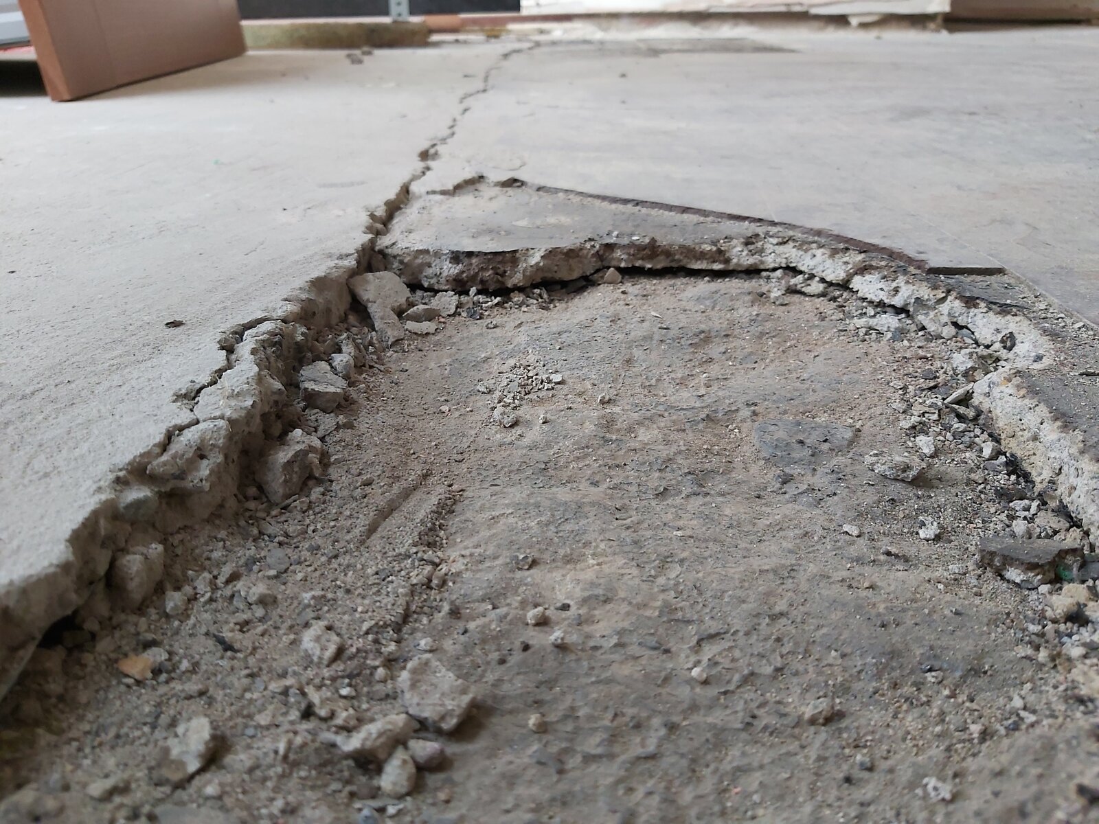 Once we got the carpet up we noticed that there was a crack right where the original floor meets the extension floor. When you stand on the old floor, there is movment of a few millimetres up and down. Which flooring contractors have said is no good for screeding over.