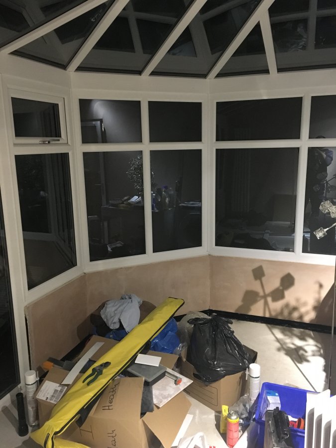 I had a new pvc conservatory erected on an existing single brick dwarf wall. One large wall between my garden and the neighbours is double thickness. The company who erected it suggested I paint the wall internally with a bitumen type paint to damp proof it then dot n dab insulated plasterboard. I painted 3 coats as directed on the tin and once dry I dot n dabbed the insulation board along with hammer fixings then had a plaster skim the walls. As expected lots of condensation as the plaster dried out. Its been two weeks and plaster seems to have dried nicely and all condensation on windows and roof has cleared. The problem i have is on the single brick dwarf walls, condensation still builds up and runs down the wall in the small void created by the adhesive and pools on the floor. Ive not fitted skirting or window ledge yet.