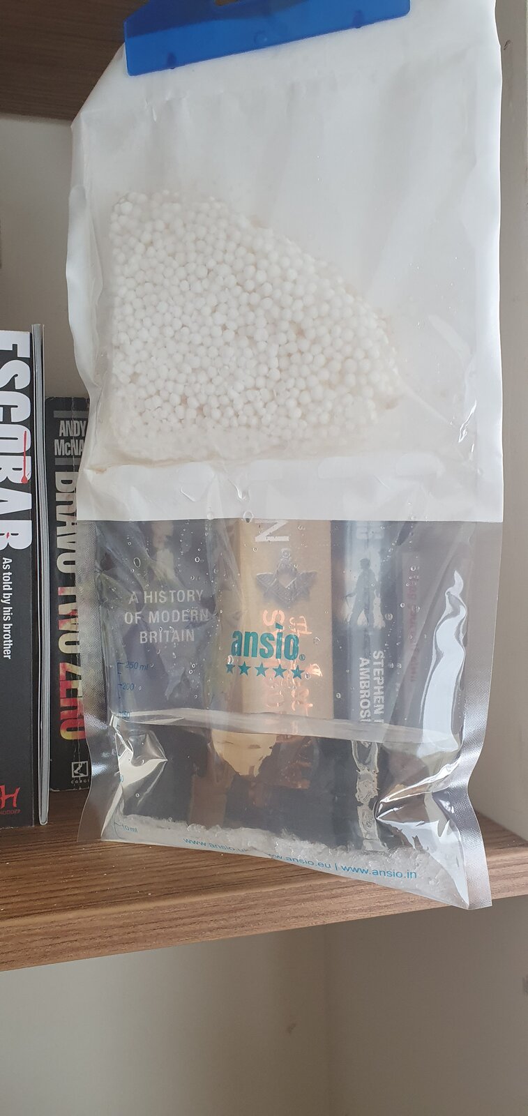 I did hang a couple of those wardrobe dehumidifier packs a couple of weeks back and at the time didn’t realise there was mouldy stuff in there!, they have been there for a week and half now, and they have collected up a fair amount of water (see pictures) which probably makes sense if all the clothes were full of moisture!