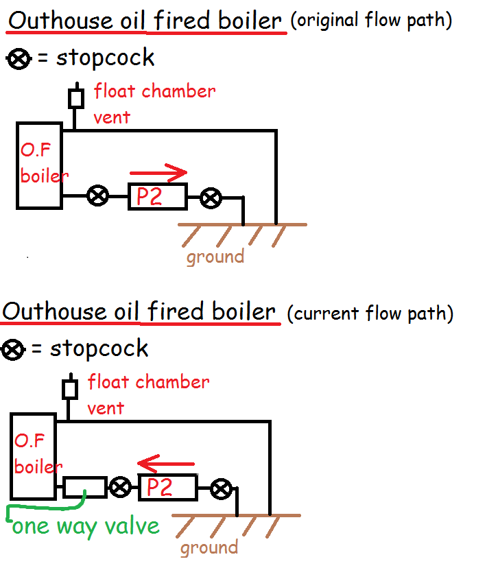 My friend wanted to change the corroded and seized stopcocks in the outhouse and I noticed that P2 was drawing from the bottom of the boiler. In what may turn out to be a Homer moment I suggested that it might be better to reverse P2 so that it feeds the bottom of the boiler and we added a oneway valve.
