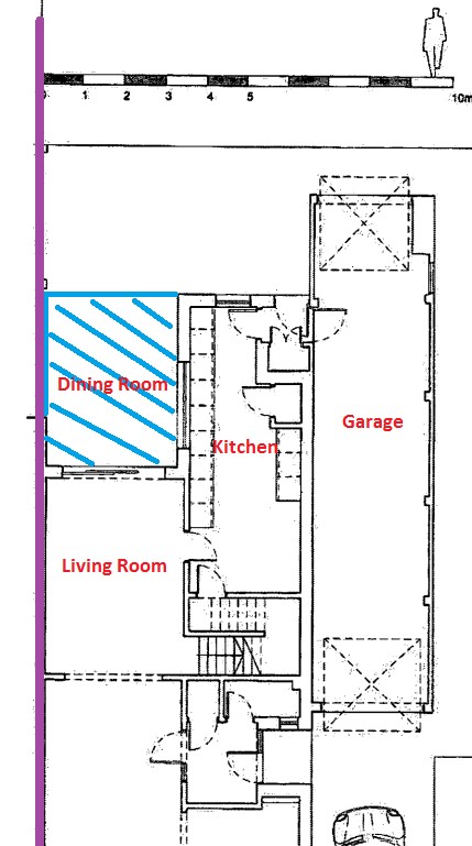 I've attached a layout, the purple line is the division between mine and my neighbours house and the blue square is the area we want to add (approximately 4m in length).