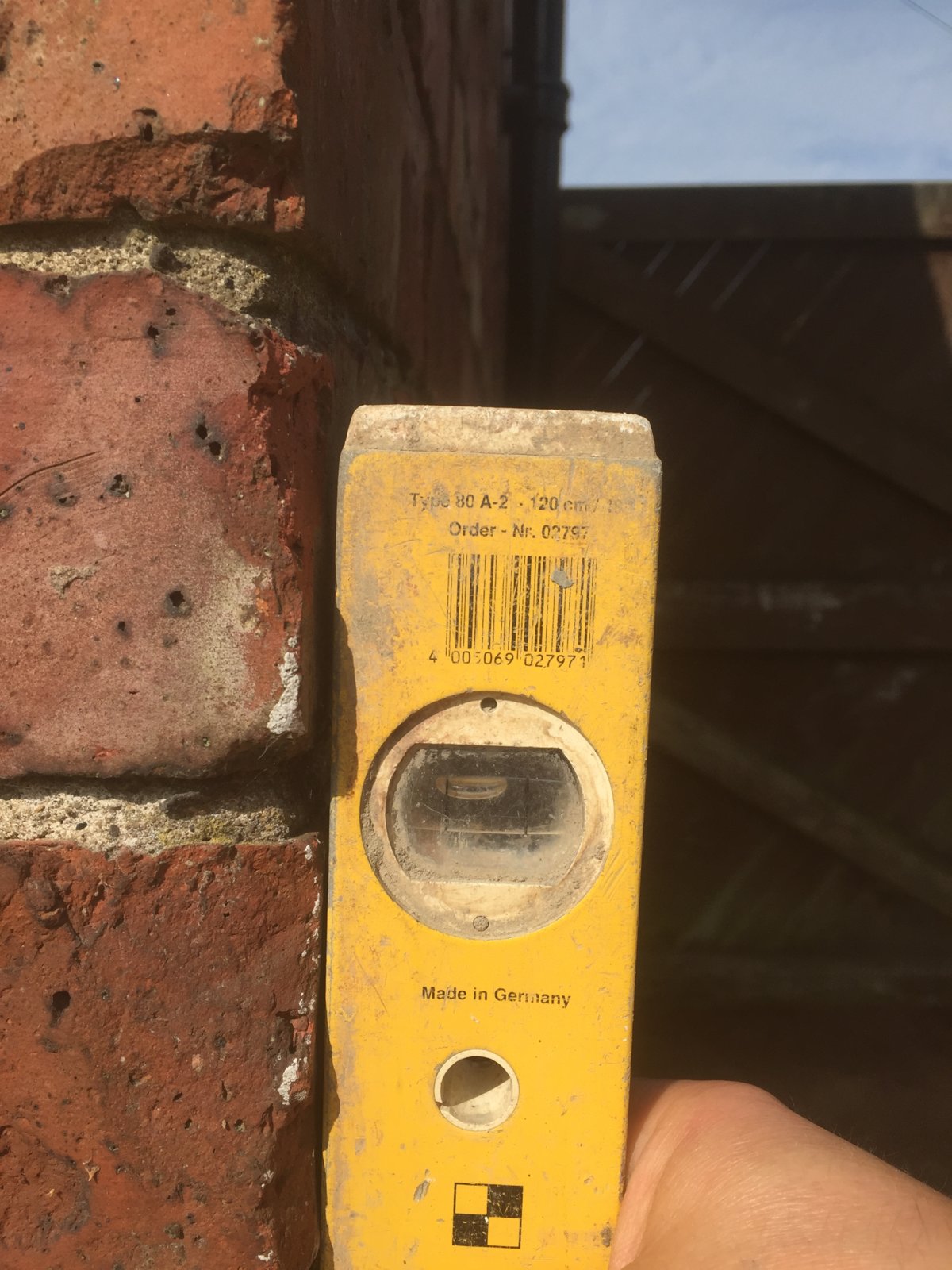 I have used a different level and the same reading happens. When i held the level and straight edge a little further back on the wall it was level, but the brick work at the top was not leaning out, but inwards. I put a piece of cardboard to show the gap.