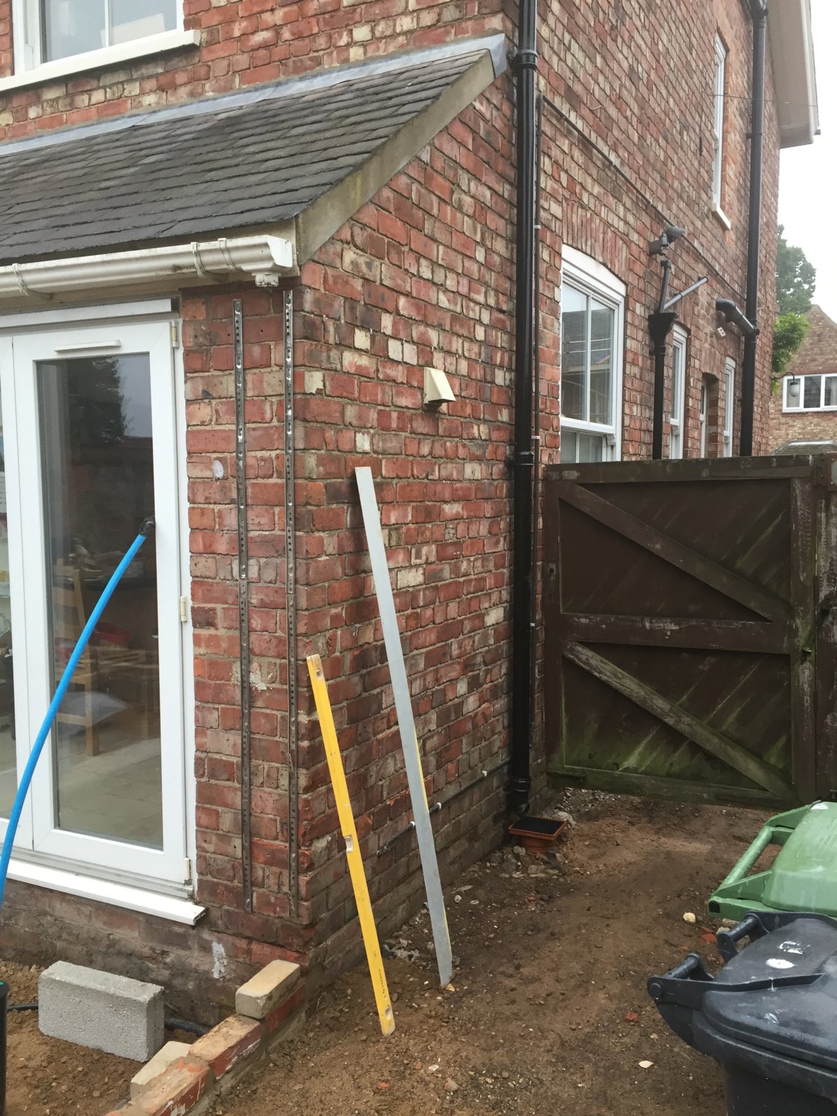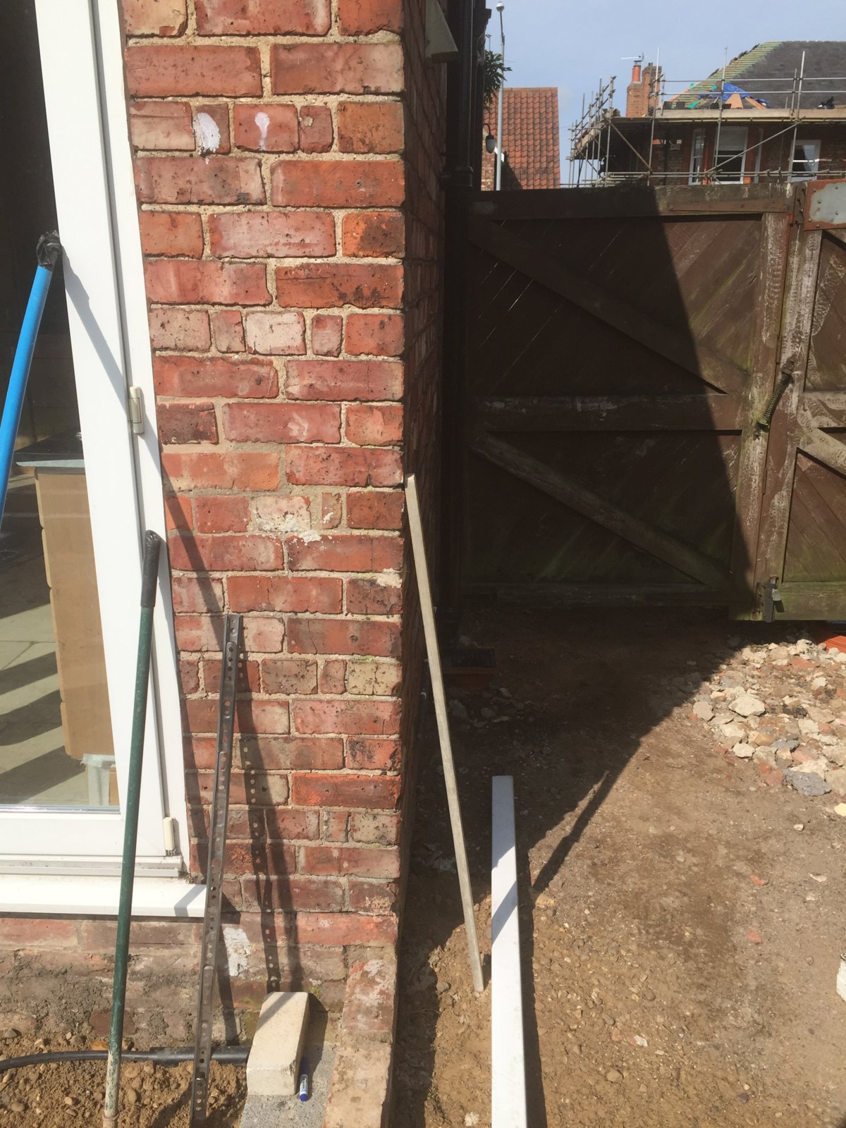 I need to continue the wall in the correct brick courses. I am not knocking out bricks and have gone for the easier option of a wall starter kit. So i will have a 2.3m long join, but i can live with this. I wasn't planning on putting in a silicon gap here. Maybe i will need to. But i am going to be building higher than the current wall as this is set at a 35 degree pitch and i am fitting a flatter roof. So i will be running in some courses higher up and this area will join in properly as you would get with toothing.