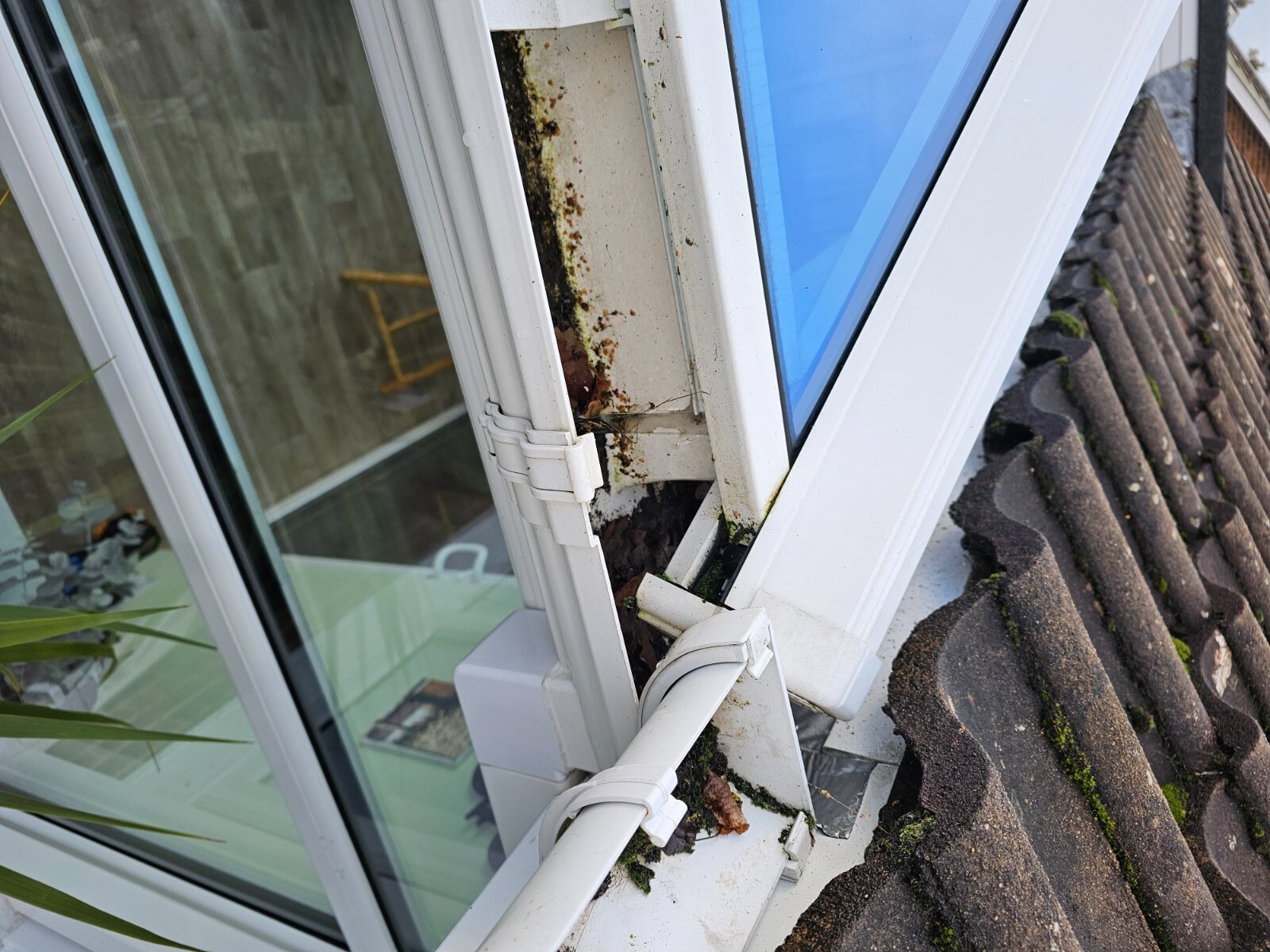 Yes the water dripping down the glass is on the outside. It's raining persistently here but can't see a drop of water coming through today, typical! Or even a sign of water marks on the inside of the section I'm pulling down. Originally years ago when all this started the water was dripping from halfway down the glazing bar/rafter which is the corner one in the photo. This stopped but the leak from the cloaking continued (from what I call the jointing strip) and then it moved long to the. right to where the cloaking meets the window,