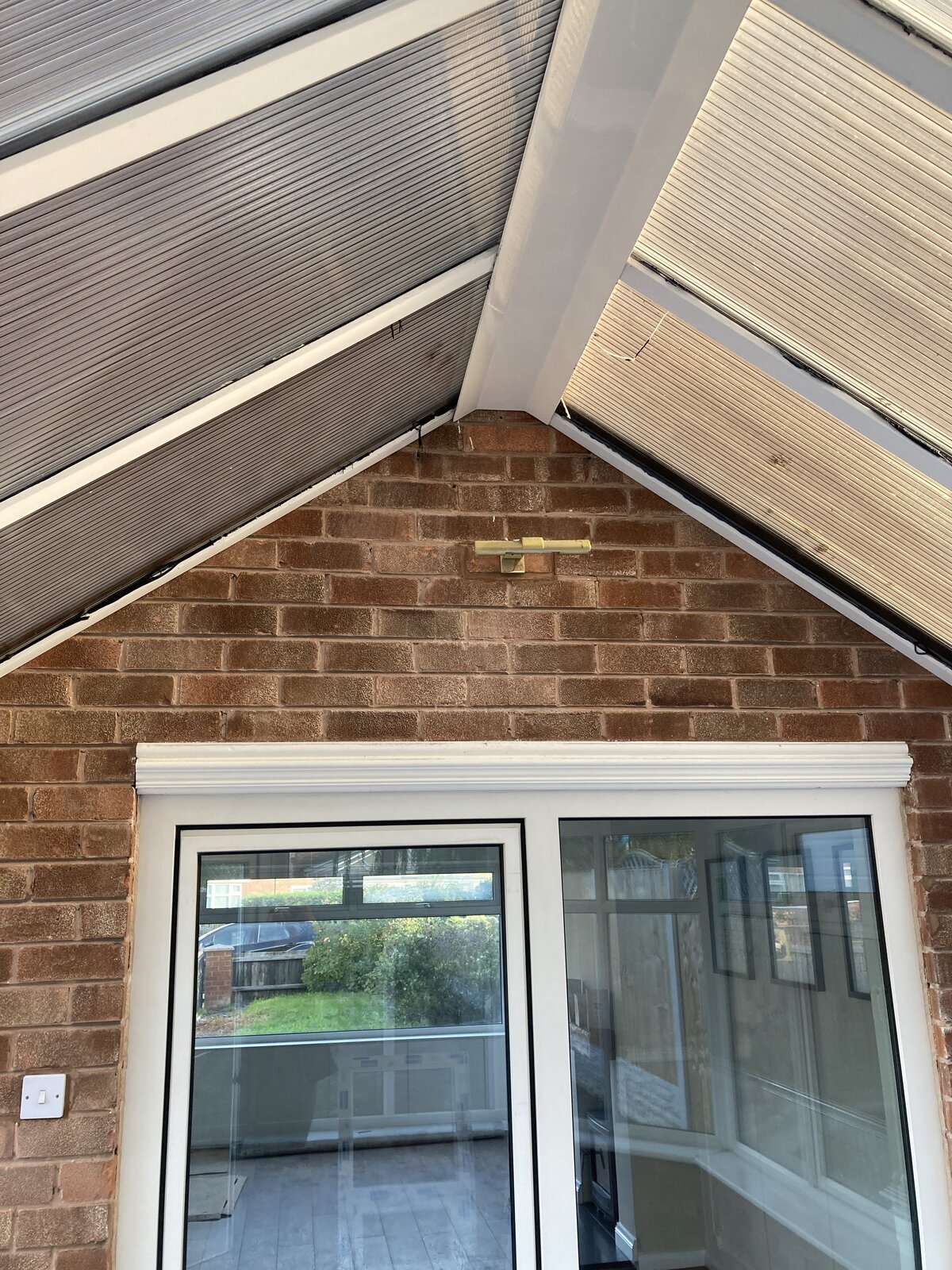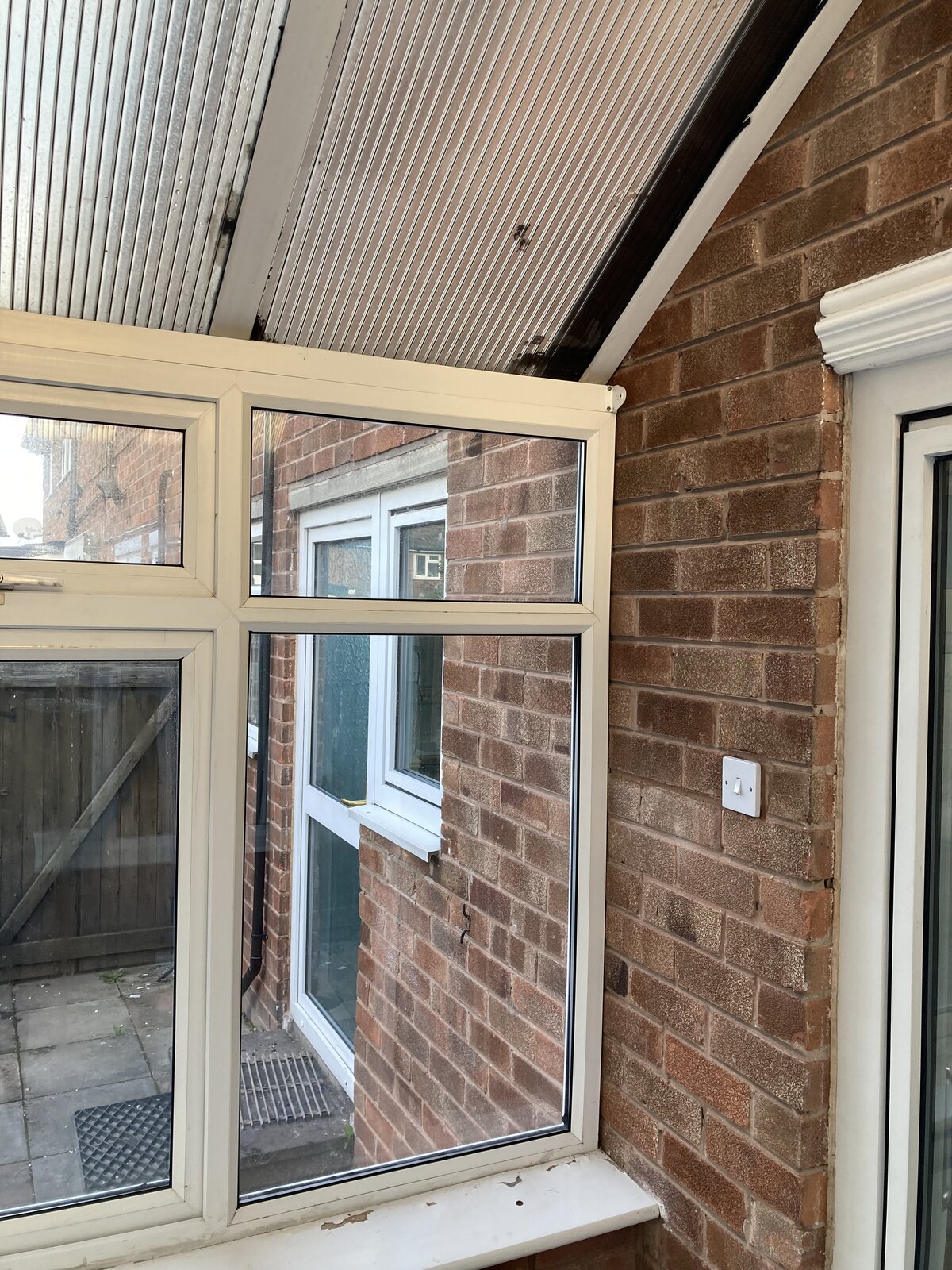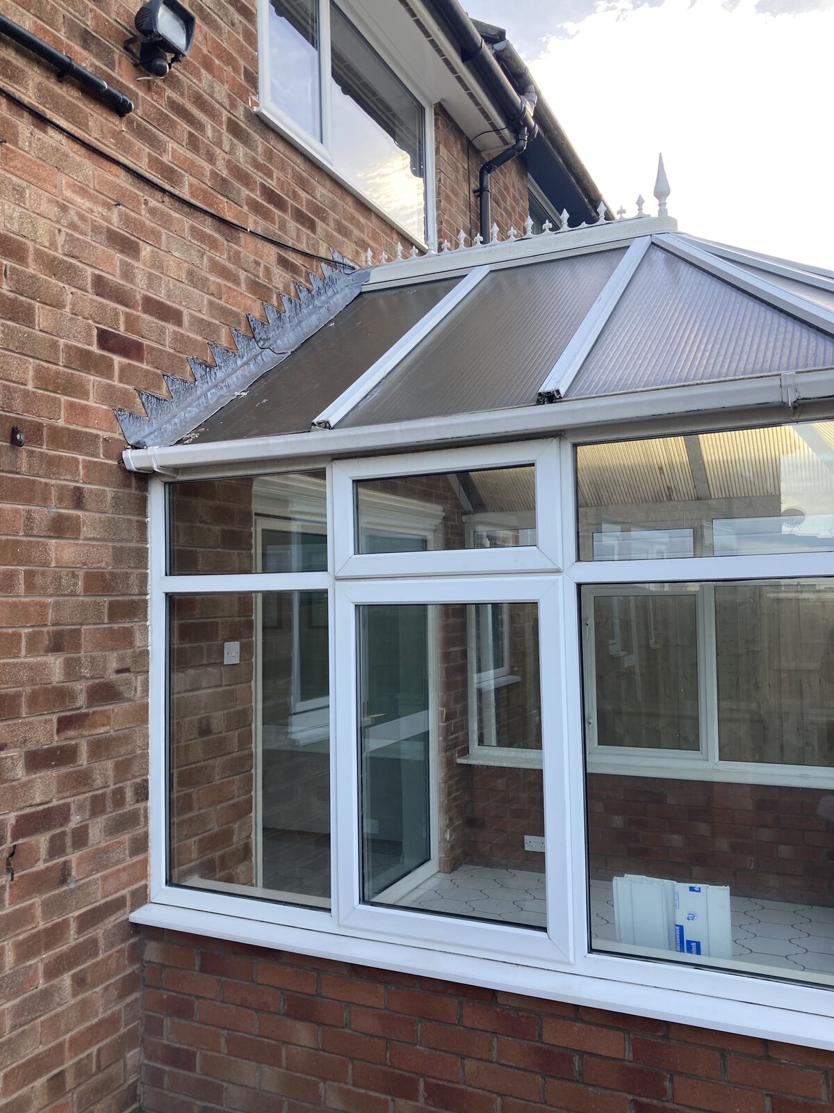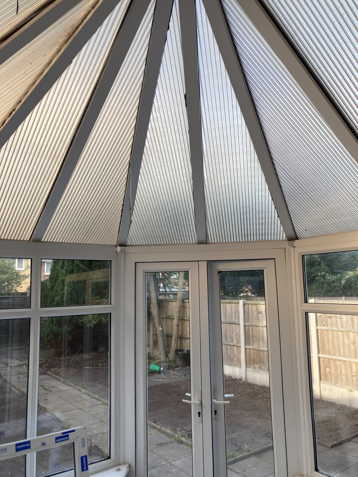 After some advice please! I’ve recently bought my first home which came with a lovely 30+year old conservatory. The roof is made of polycarb which has holes in it and leaking water. All the seals have gone. I’ve had a few people come to look at it first was trying to sell me a lightweight tiled roof at 6k which is well out of my budget due to other house improvements I’ve had to do. I’ve tried to go down the route of just replacing the poly carb with new stuff but no one seems to want to touch it. Can someone please tell me the best way around this as I feel like I’m getting no we’re with it. I work for a door company so can get white pvc panels cheaply would this work? Or should I stick with poly carb and Just keep trying to find someone that will do it. The last person said about it could be a nightmare job as the white bars are so old they might not come off in one piece. Please help! Photos attached