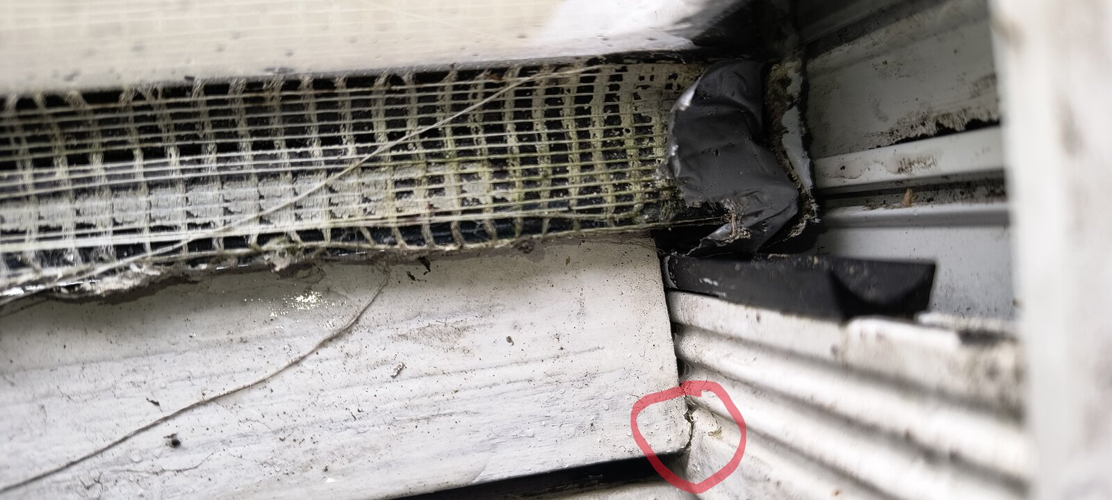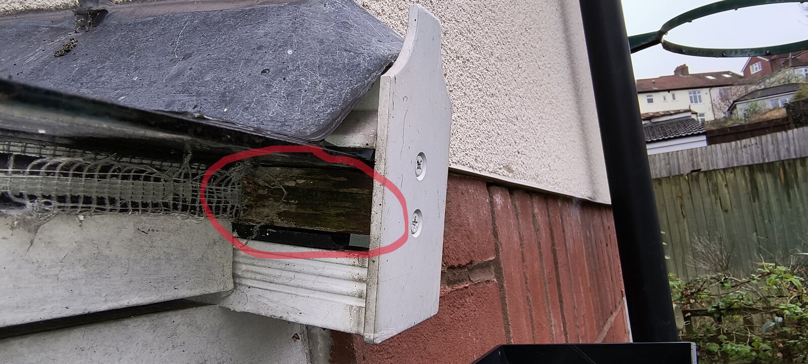 Water is leaking down from where I have made a red circle in photo 2. The water is now missing the guttering and causing the wood fascia to rot. No water inside the conservatory.