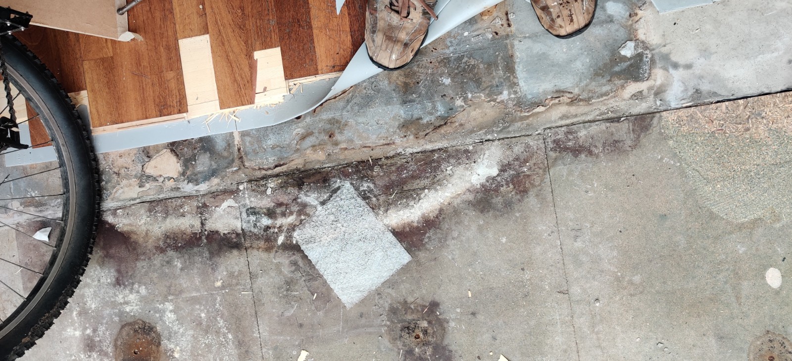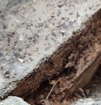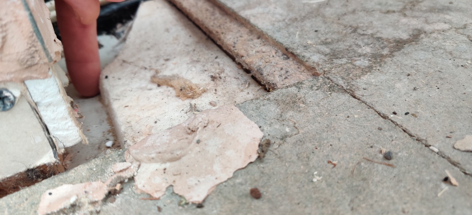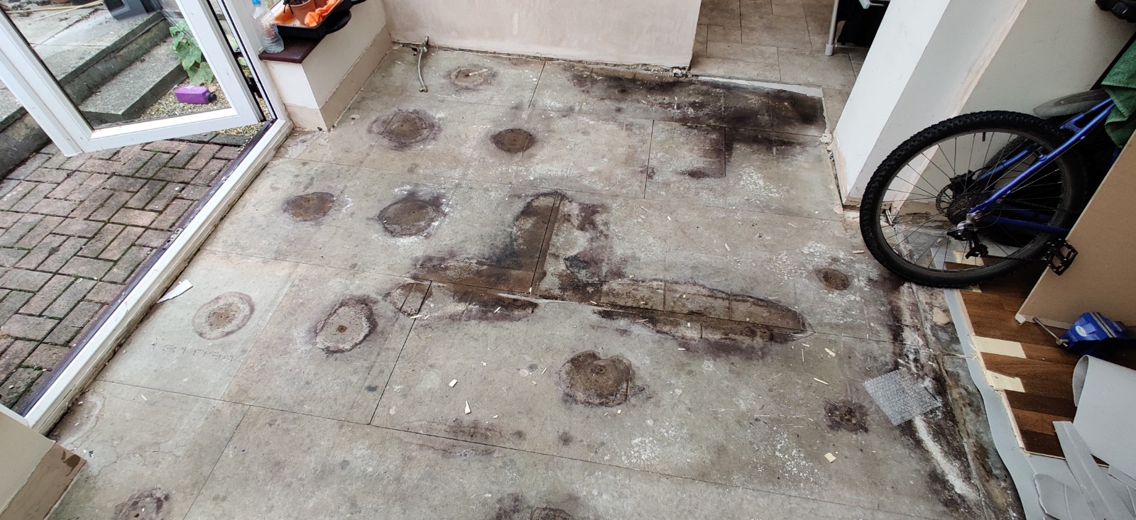 Looking at the photos attached, I can see a bit of foam insulation at the side, but its very thin. Theres another very small bit of slightly exposed foam, which might be thicker, but cant really tell without pulling it up. The conservatory floor joins right up against a concrete floor on the dining room, which also seems to have mould/damp. Lots of the damp patches are found and in the middle of each of them is a rusty screw.