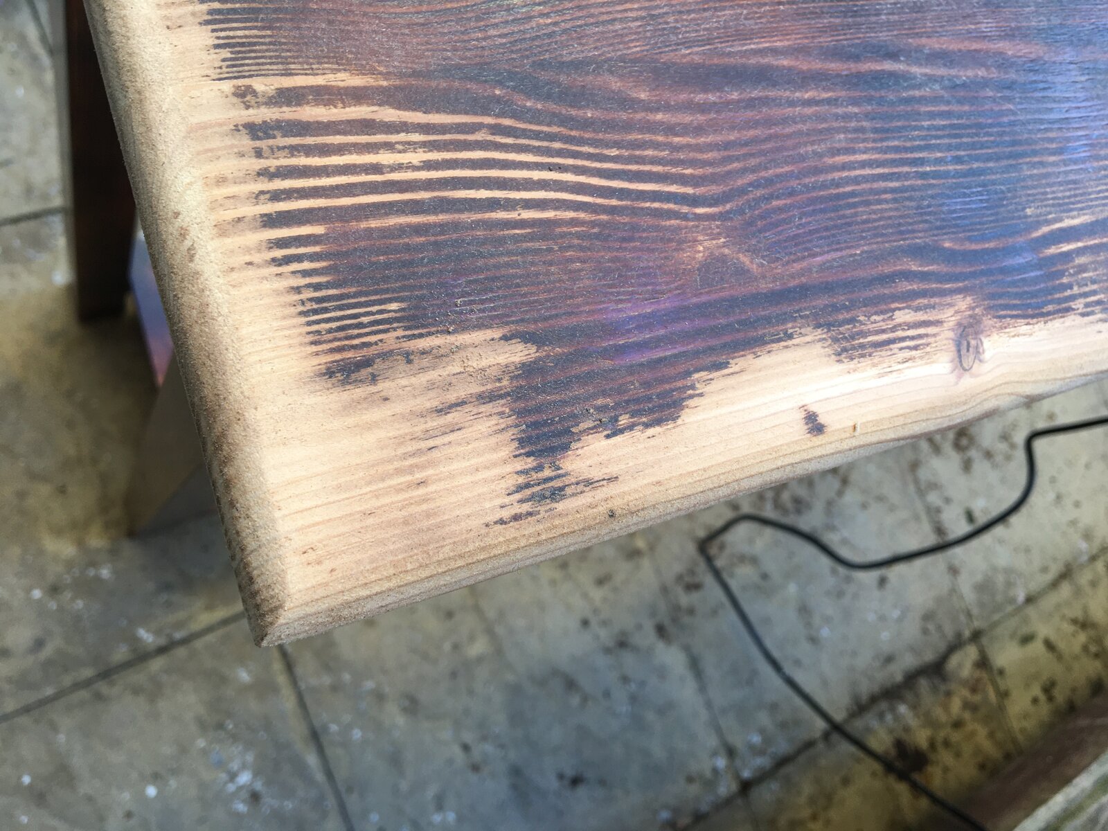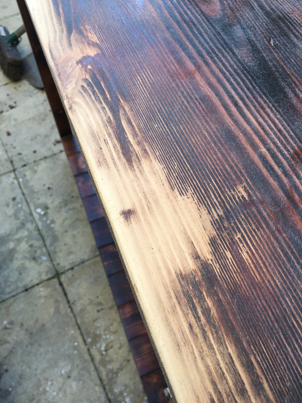 I bought an old console table recently. It's covered in a horrible dark, sticky varnish type coating which gives the wood grain a strange orangey hue from certain angles. Almost looks as if someone has painted gravy on there and left it to dry. It's a b****r to sand off as well.