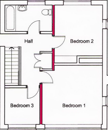 4) Upstairs the wall is "buttressed" in 4 places by dividing walls.