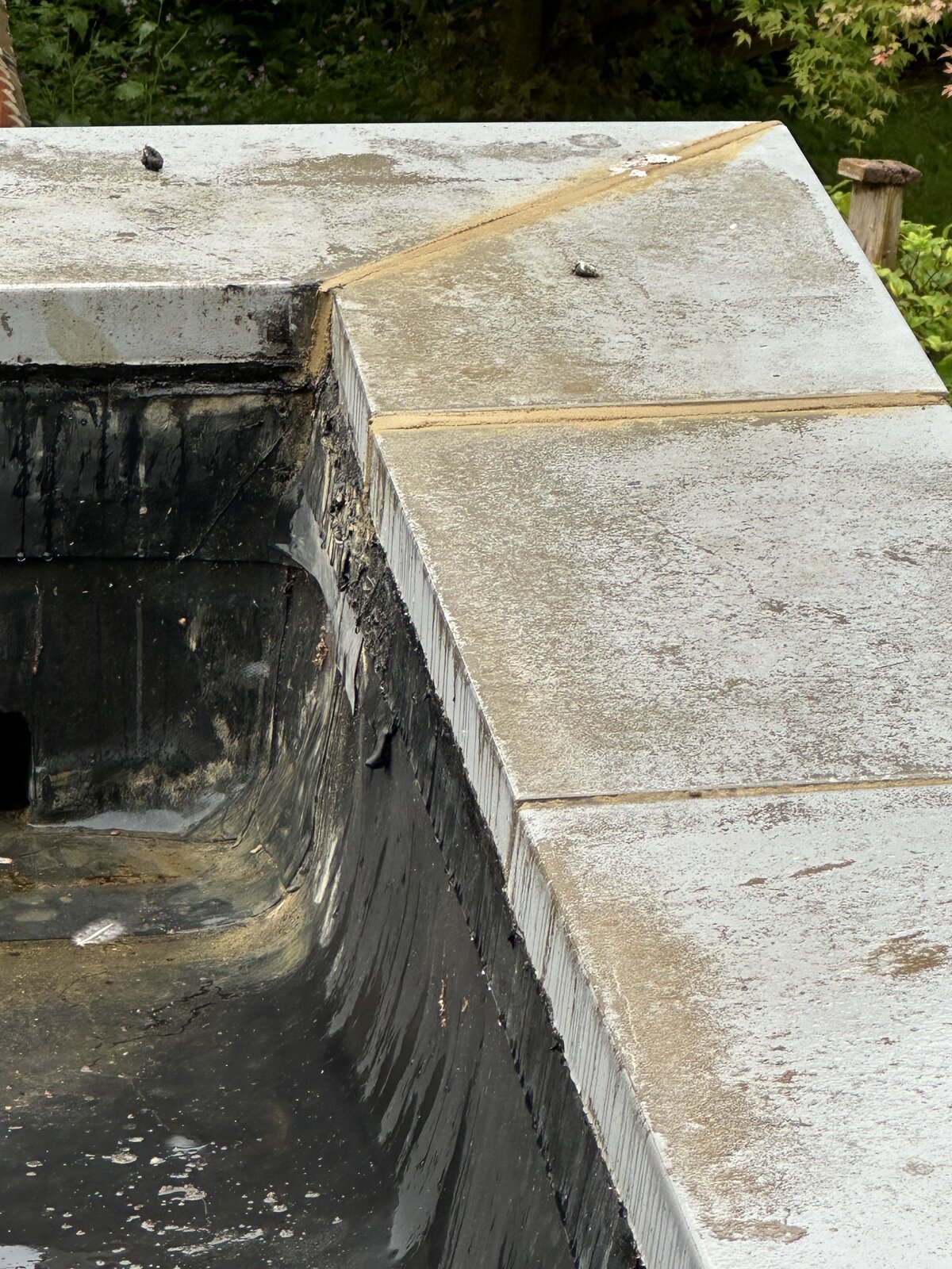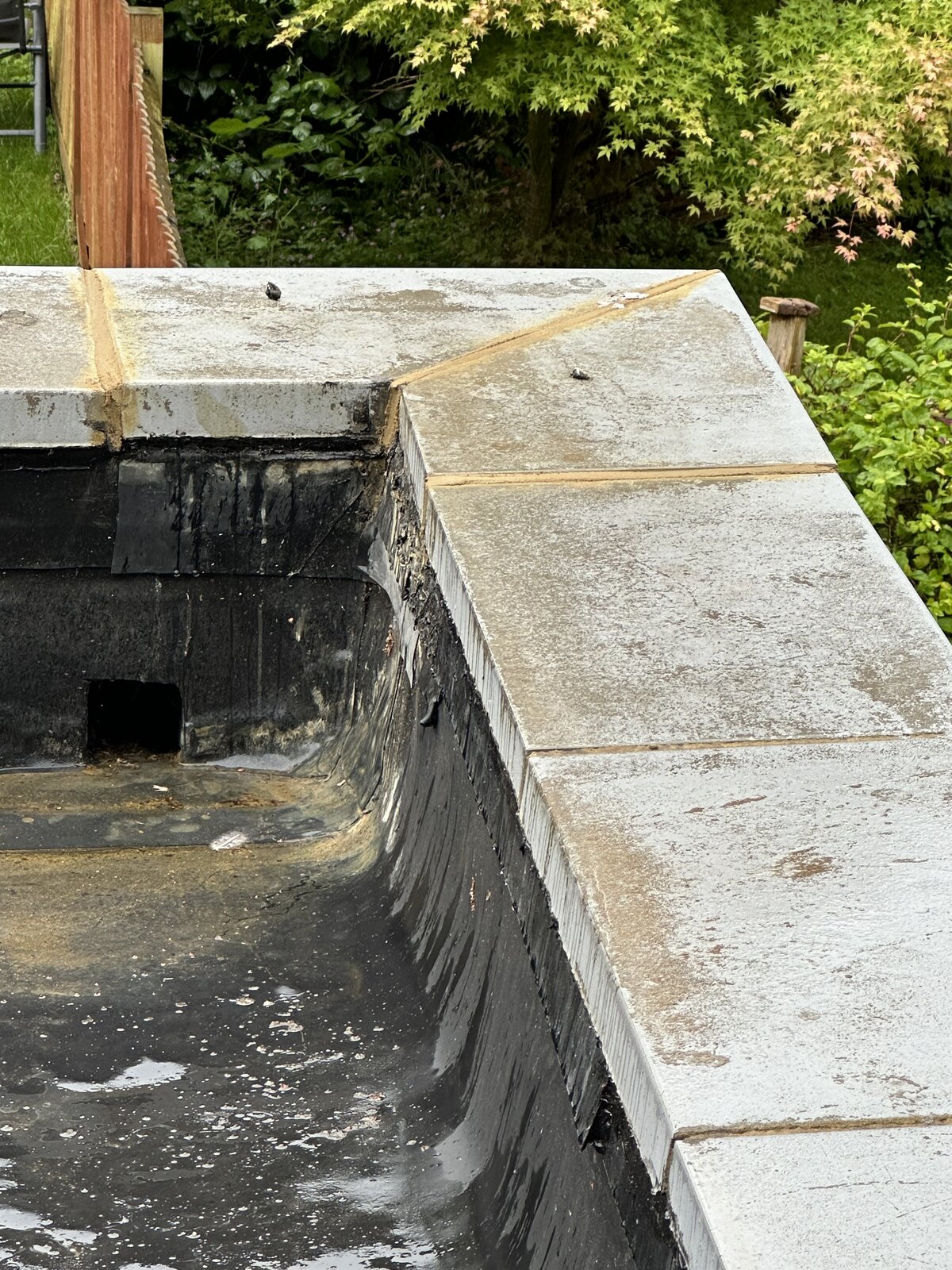 Our one is also fully lined, I don’t think is blocked as when it rains the water run trough fast. We have tried to repair the corner last week, that’s why it looks so messy. I am concerned that the coping stone is not wide enough as it should go over the inside wall bit, is that right? Rest of the roof is fine is just the corner.