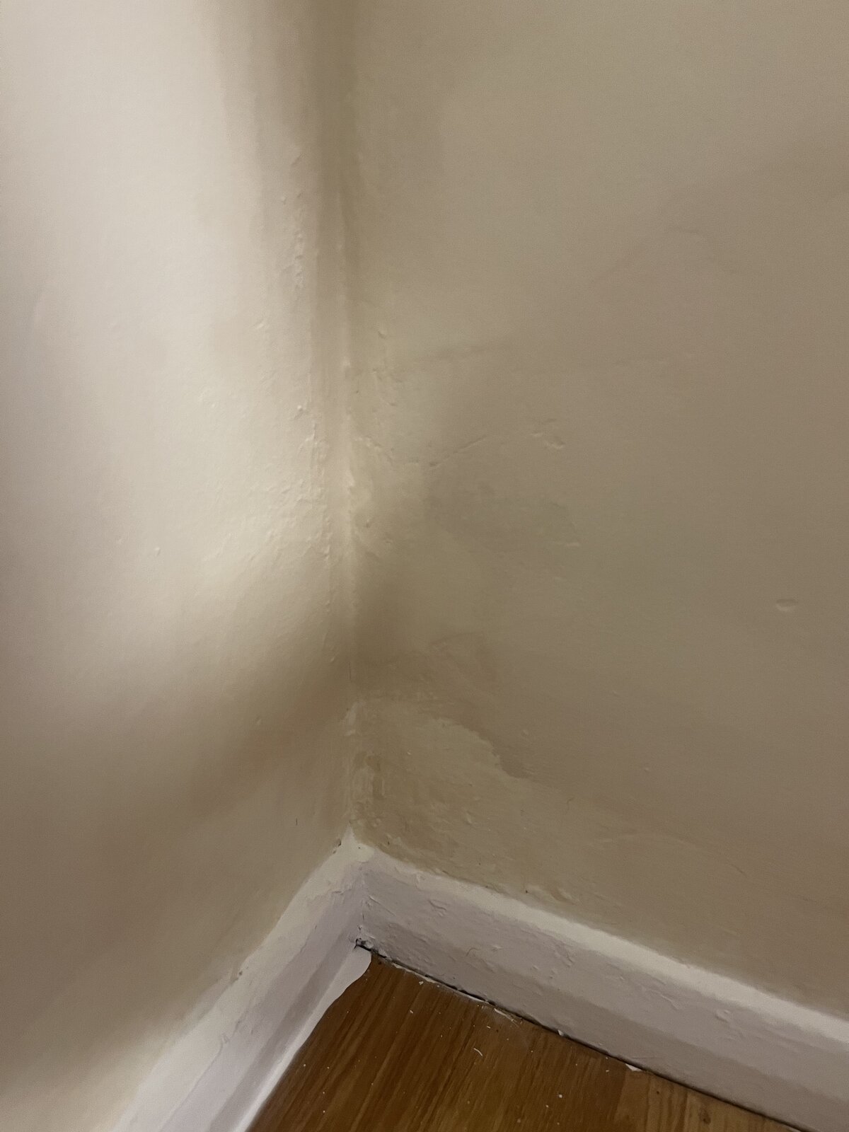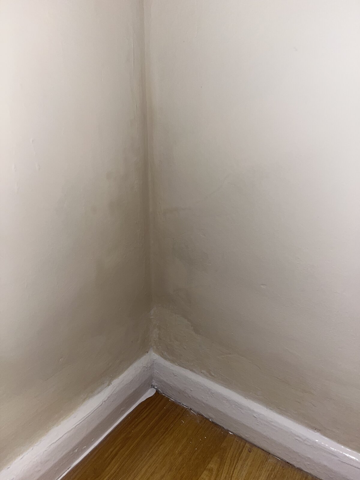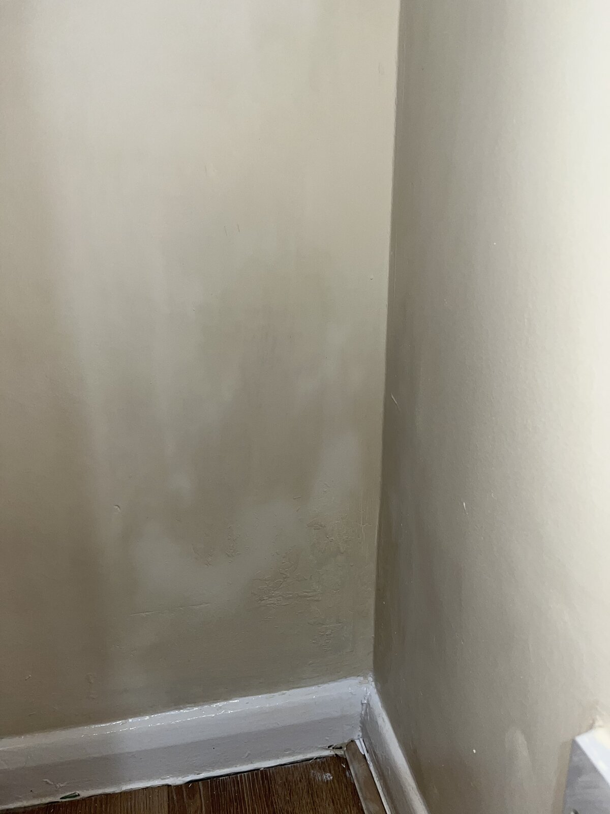 Recently moved into a new property and discovered that two corners in the living room are wet to the touch right at the bottom corner, this is on the wall that connects us the our neighbours. In the spare bedroom which is directly above one of the corners we also have a wet corner directly above.