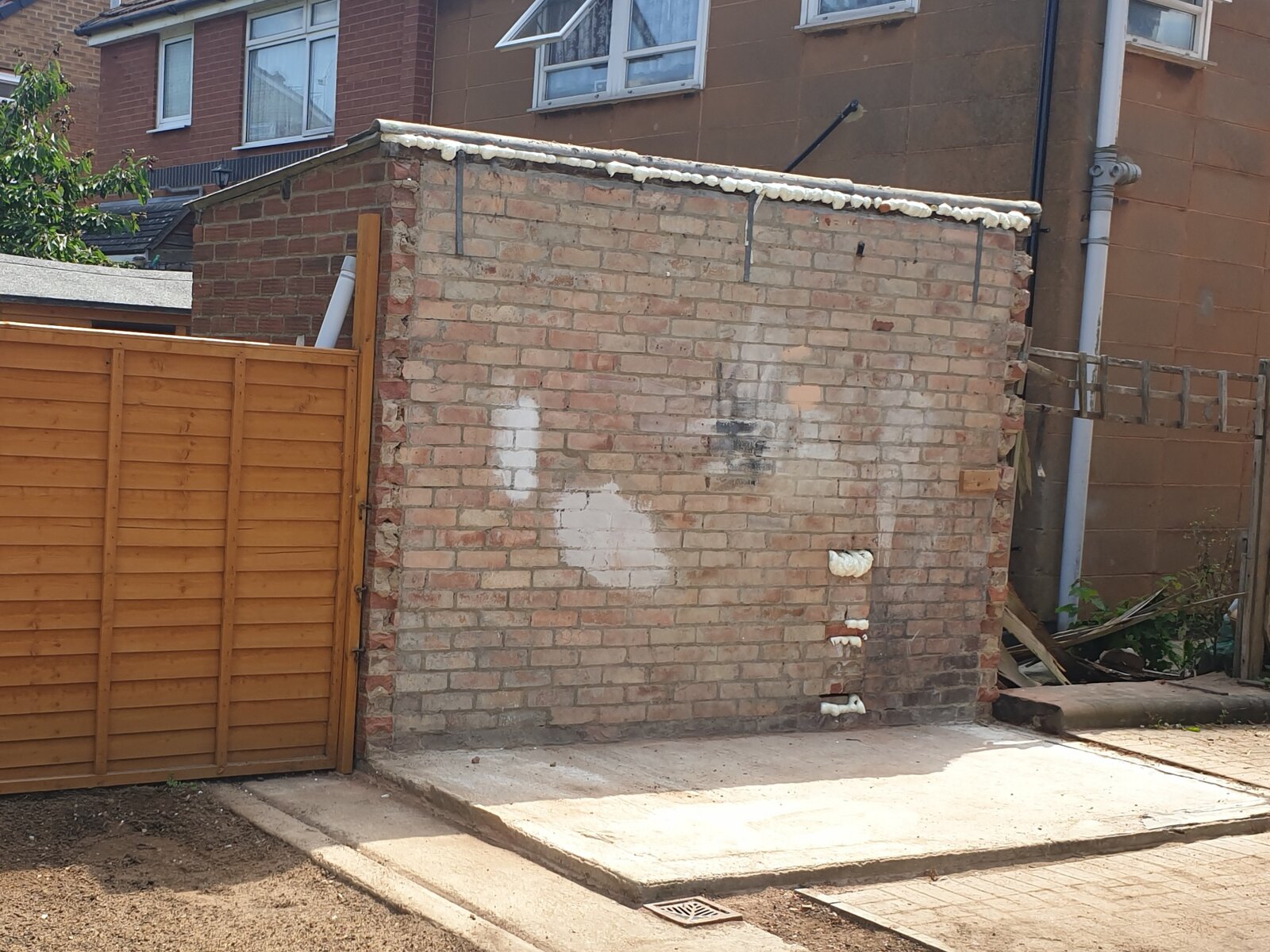 Hi all we've had our brick shed removed that was a double shed attached to the neighbour's shed. The builders filled in the gaps under the exposed roof with expanding foam as well as where bricks were removed in the middle.
