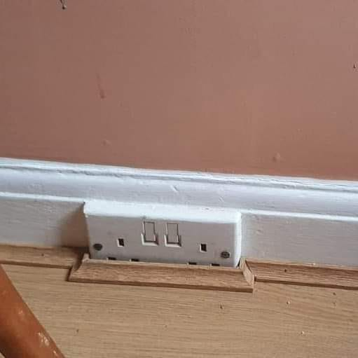 In fairness the floor layer would not have been qualified to move the sockets. Landlord most probably said go round it as he wouldn't pay for an electrician.