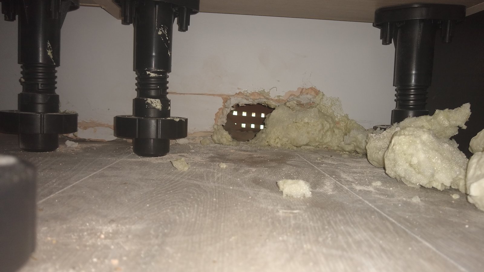 We have just had a kitchen diner extension and I've noticed some draught and it's really cold in the kitchen. I've uncovered plasterboard and the air vent is ABOVE the joists rather than below... Therefore I believe air is coming behind the dot and dab plasterboard and out into the kitchen at a section where the plasterers didn't dot and dab board all the way to floor level. I've phoned building control ... Have a done the right thing or is the vent supposed to be there? Picture is attached is taken from finished floor level and it's behind kitchen plinth/ cabinets.