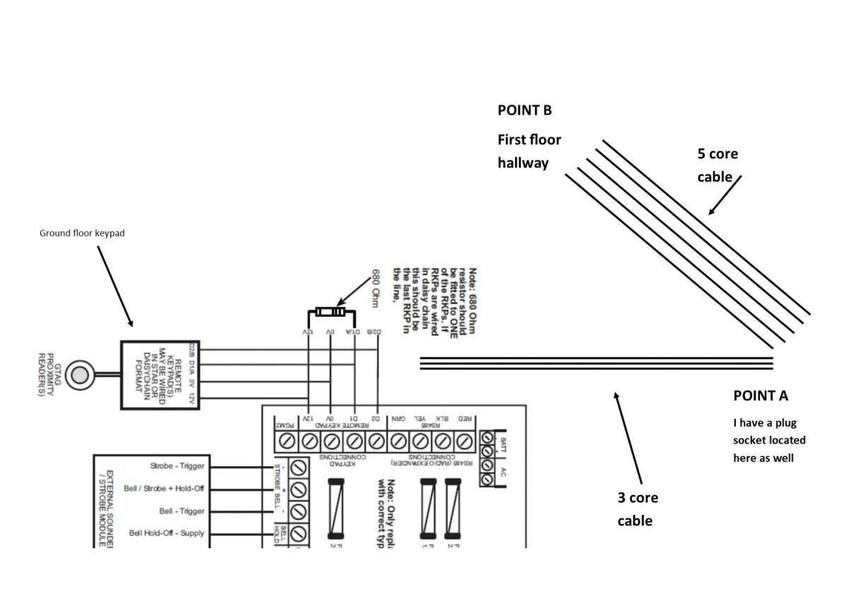 I currently have a cpx gardtec alarm which works perfectly. The only thing is that my keypad is downstairs and I would like another upstairs. I have a cable from the alarm pcb to the upstairs hallway but is only has 3 cores, I know I need 4. Is there a way to get the this working. Even if I have a local plug upstairs which gives 12 volts that will be fine however how do I wire l this up? I believe I have a cpx control panel. Many thanks.