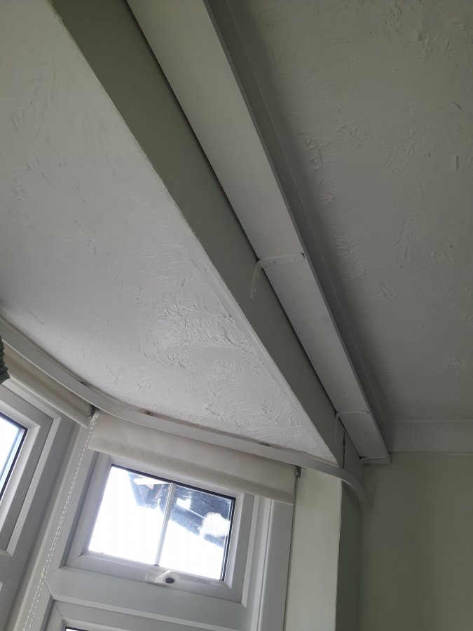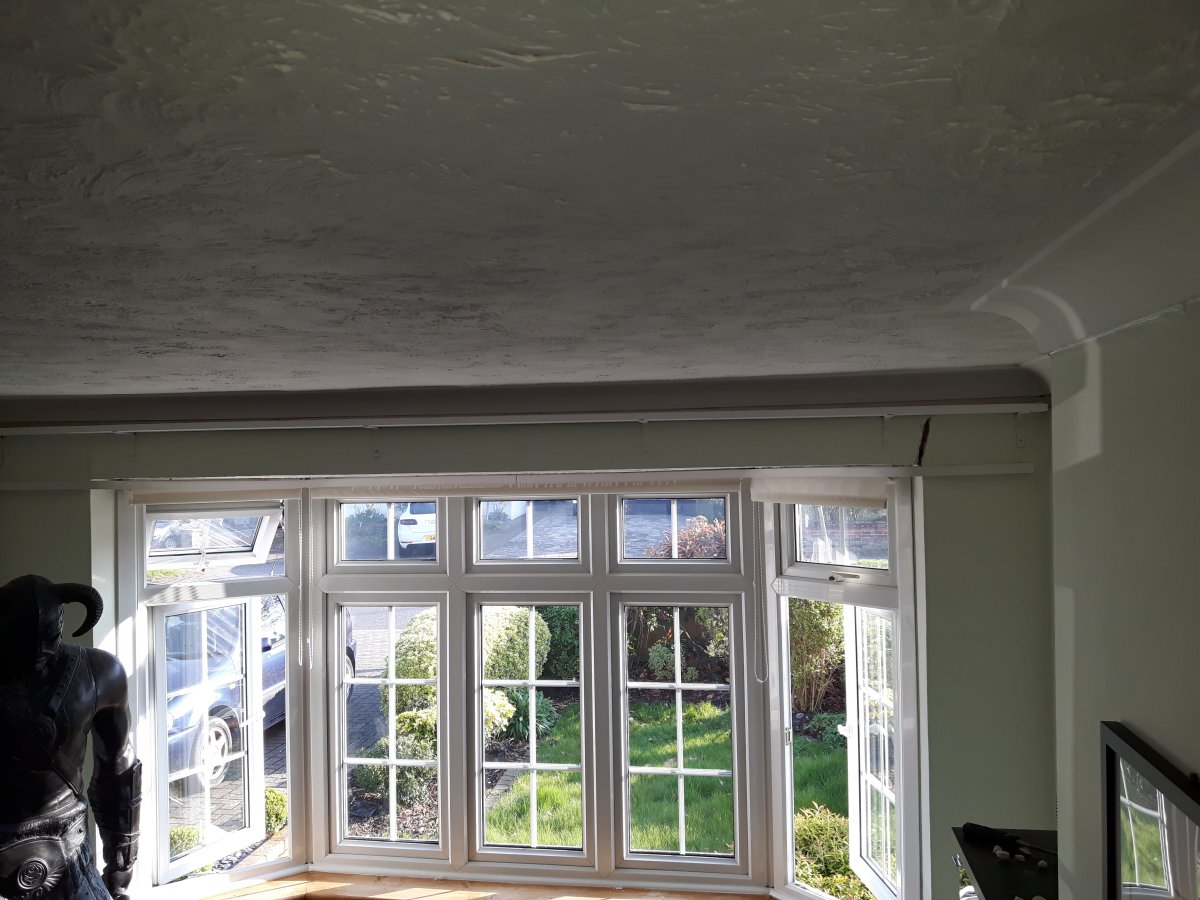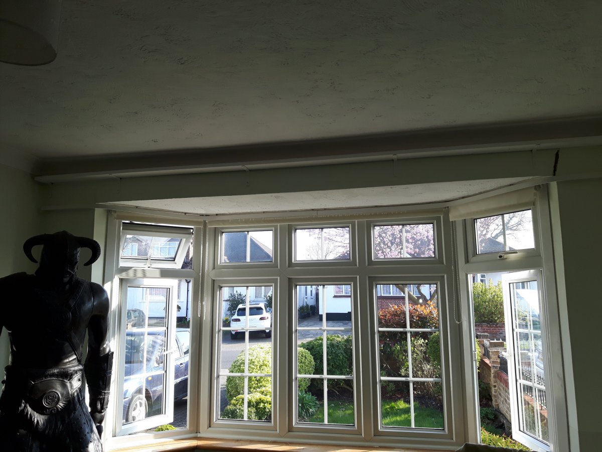 As the bay was fitted in 2000, they would have had to cut the wall out to get it in, but as there are laths above the bay, I suspect they just cut out where the hole was going to go, but didn't properly make good the inside of the wall. I suspect you'll need to knock the wall off abover the bay, support the ceiling that they've formed inside the bay, and then replaster everything.