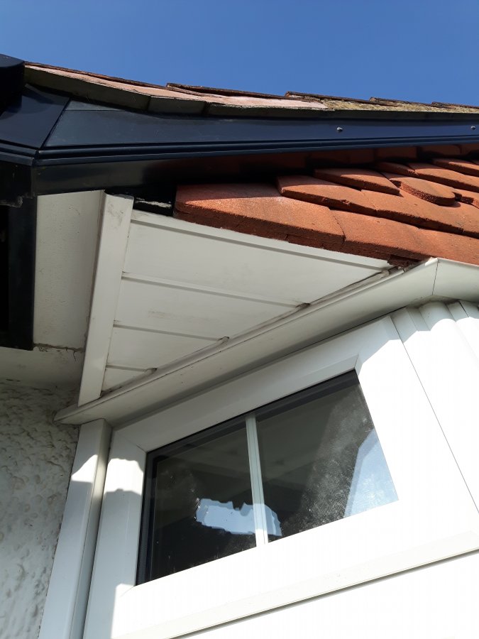 On the exterior, pic 75.3KB shows what looks like a little wood decay in the corner of the T&G soffit boards.