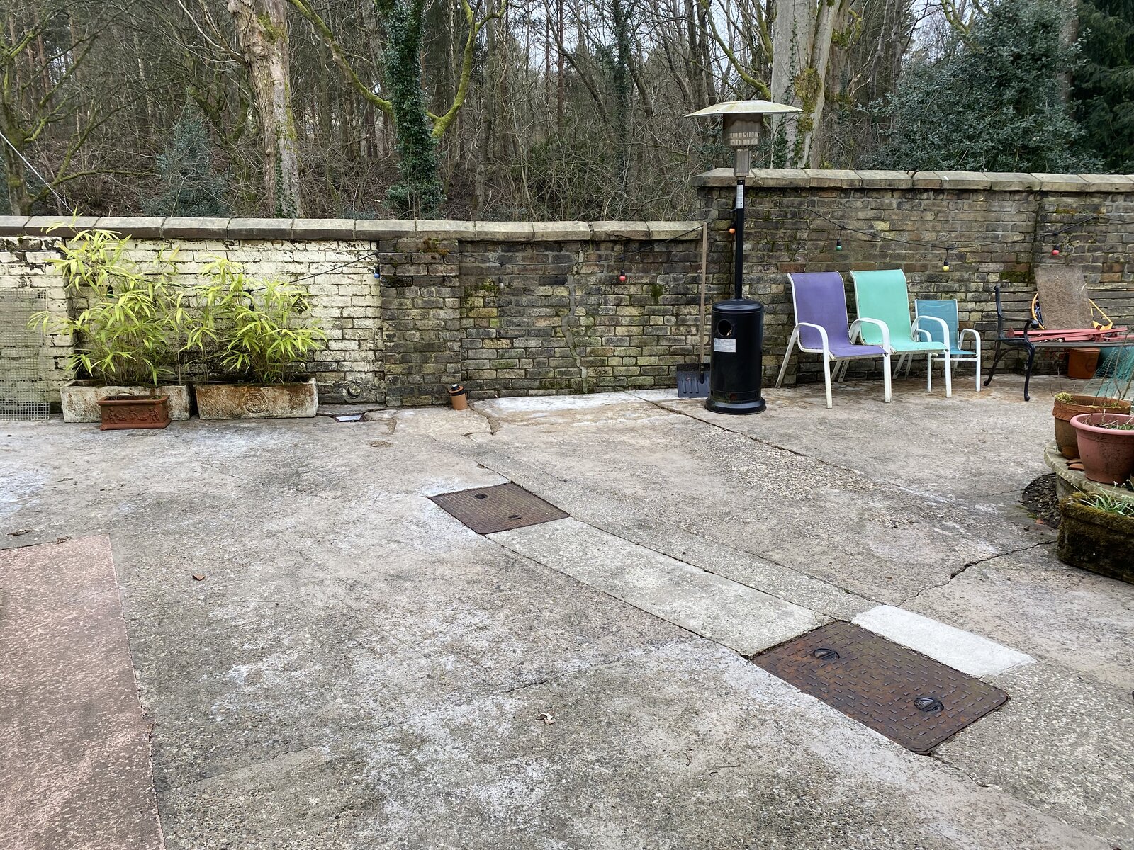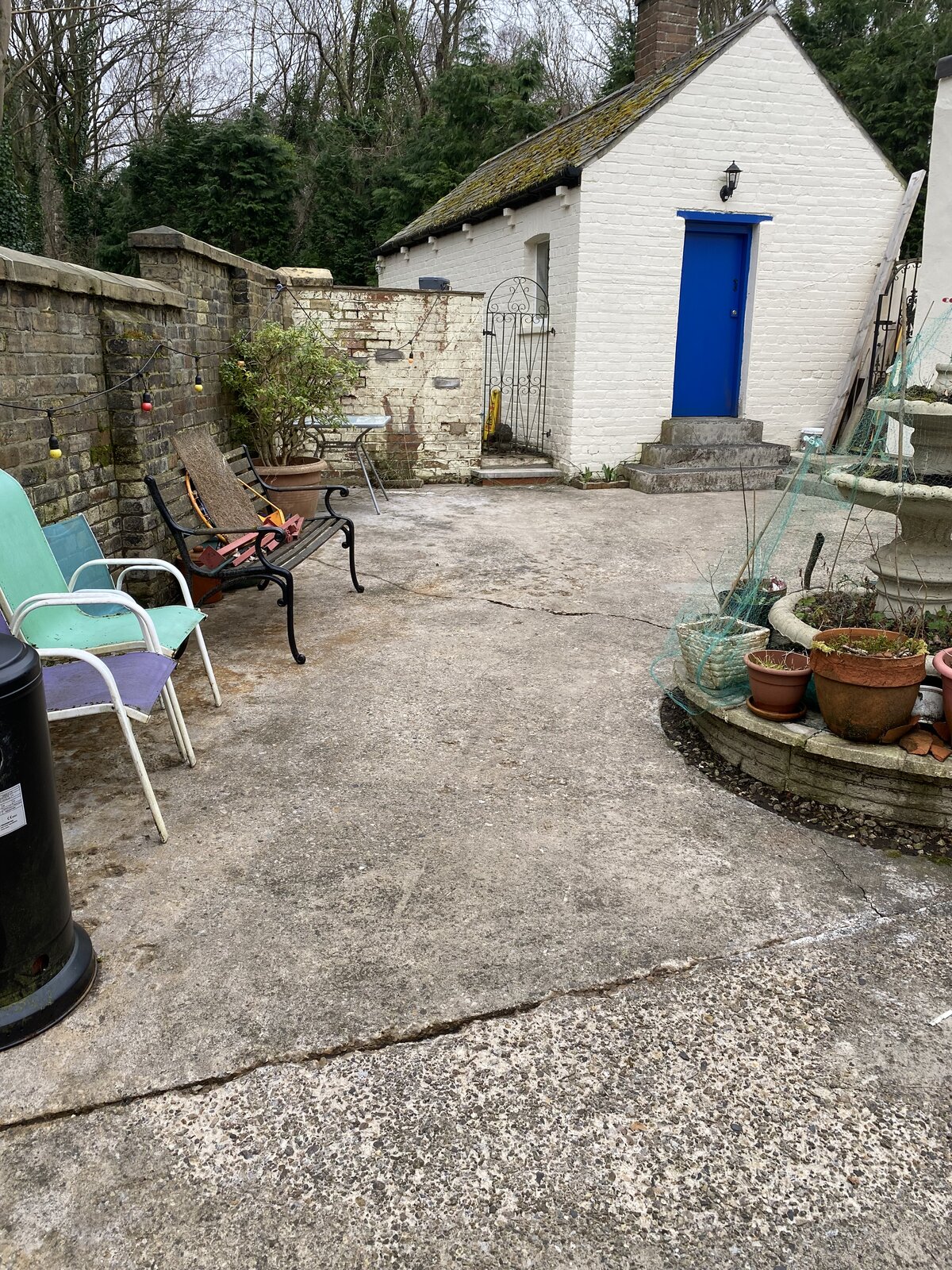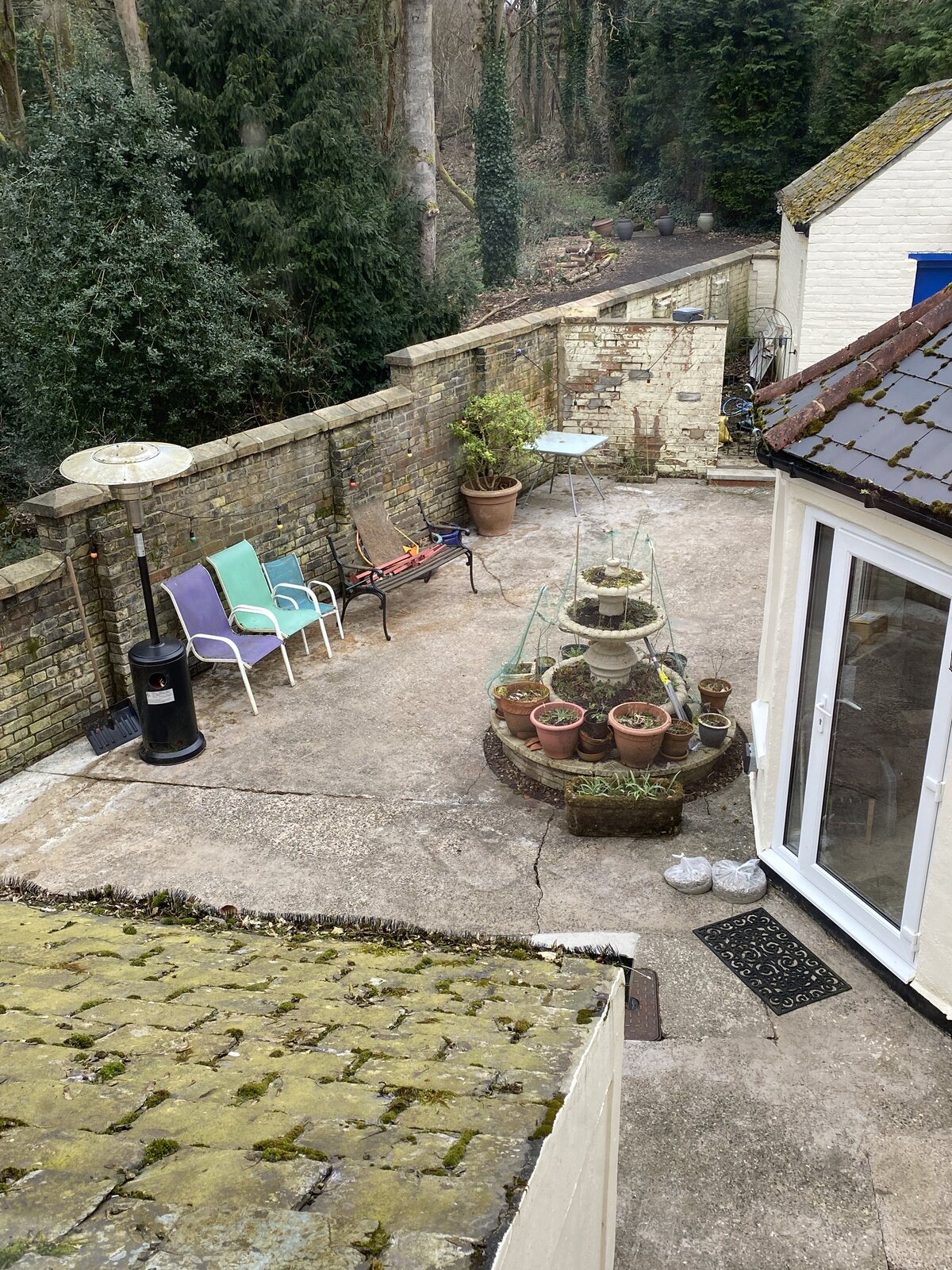 Our yard is something of the order 12x6m. It’s clearly been laid in multiple stages over the decades and been cut for access.