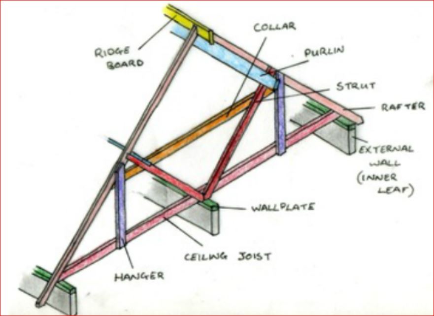 Only one of the 4 purlins is showing signs of bowing (now cracked). In the roof space originally there were no struts only thin timbers which hung the original thin ceiling joists to the rafters.The purlins would have been fine if the struts were still there