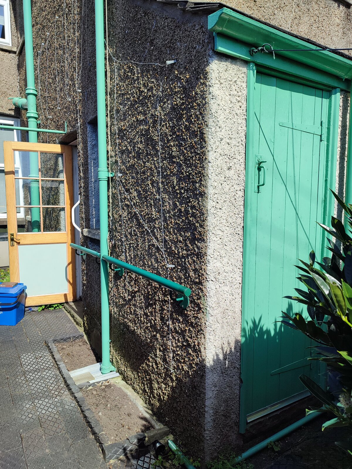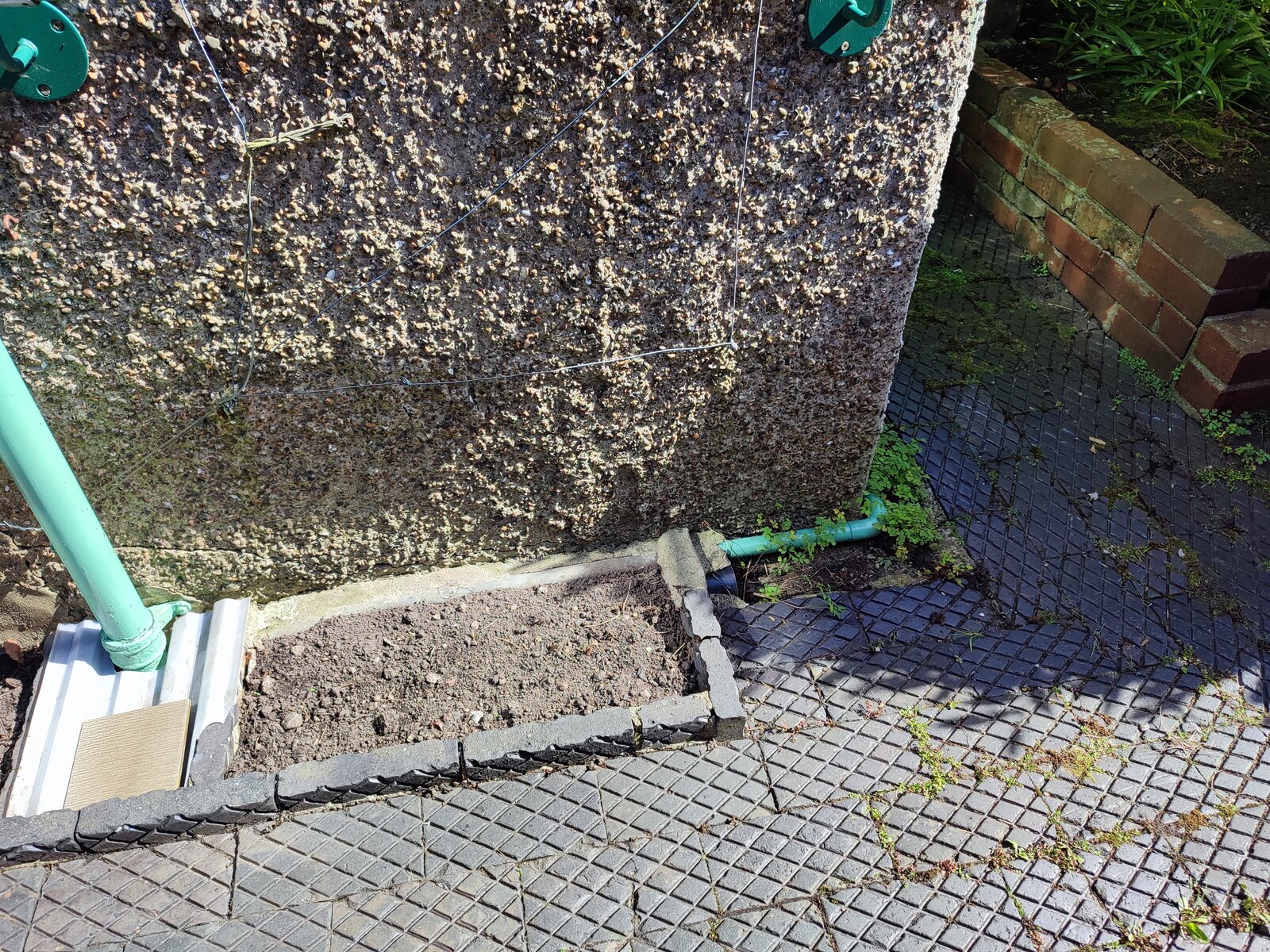 Had an offer accepted on a property but just noticed this when had another viewing.There is cracking behind drain in pebbledash - this sounds hollow and other adjacent parts have been patched up with different render (looks old). It has also had that Dutch damp proofing - you can just see round cylinder holes. House built around 1900-1910. Wires on wall are from plants.