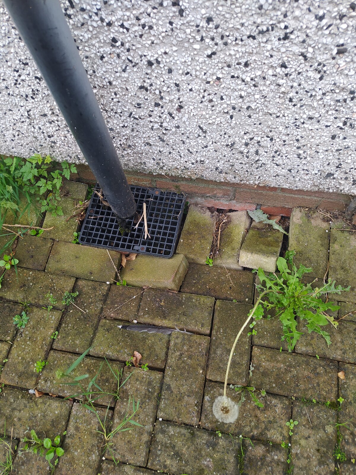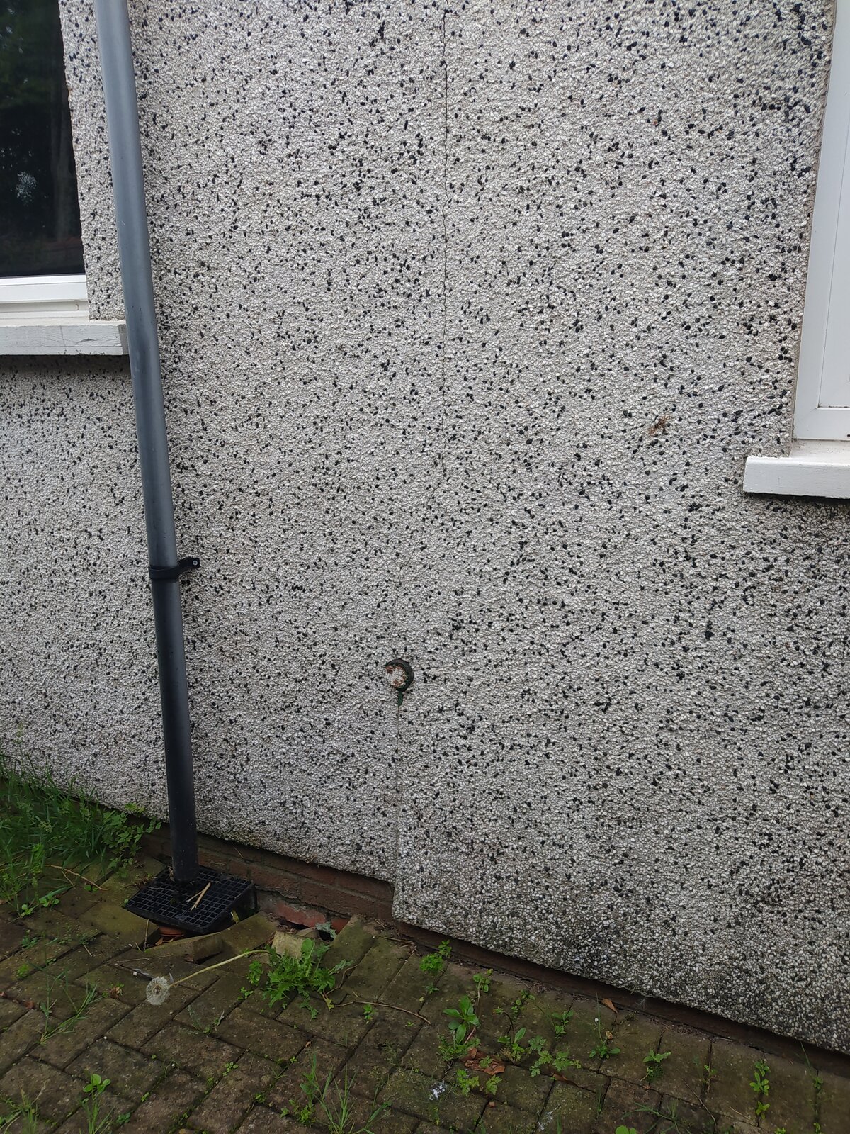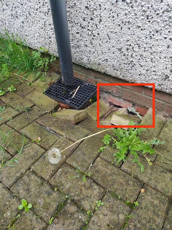 However, there is a drain nearby. The downpipe finishes slightly above the drain (don't know if it overflows). I noticed that the block paving to the right of the drain has sunk. Where the blocks have sunk you can see the bricks of the main house. There are bricks missing under the main house as I can put my hand underneath (red box on photo). I can't tell how far the missing bricks extend to the right but on the left they are there immediately behind the drain.