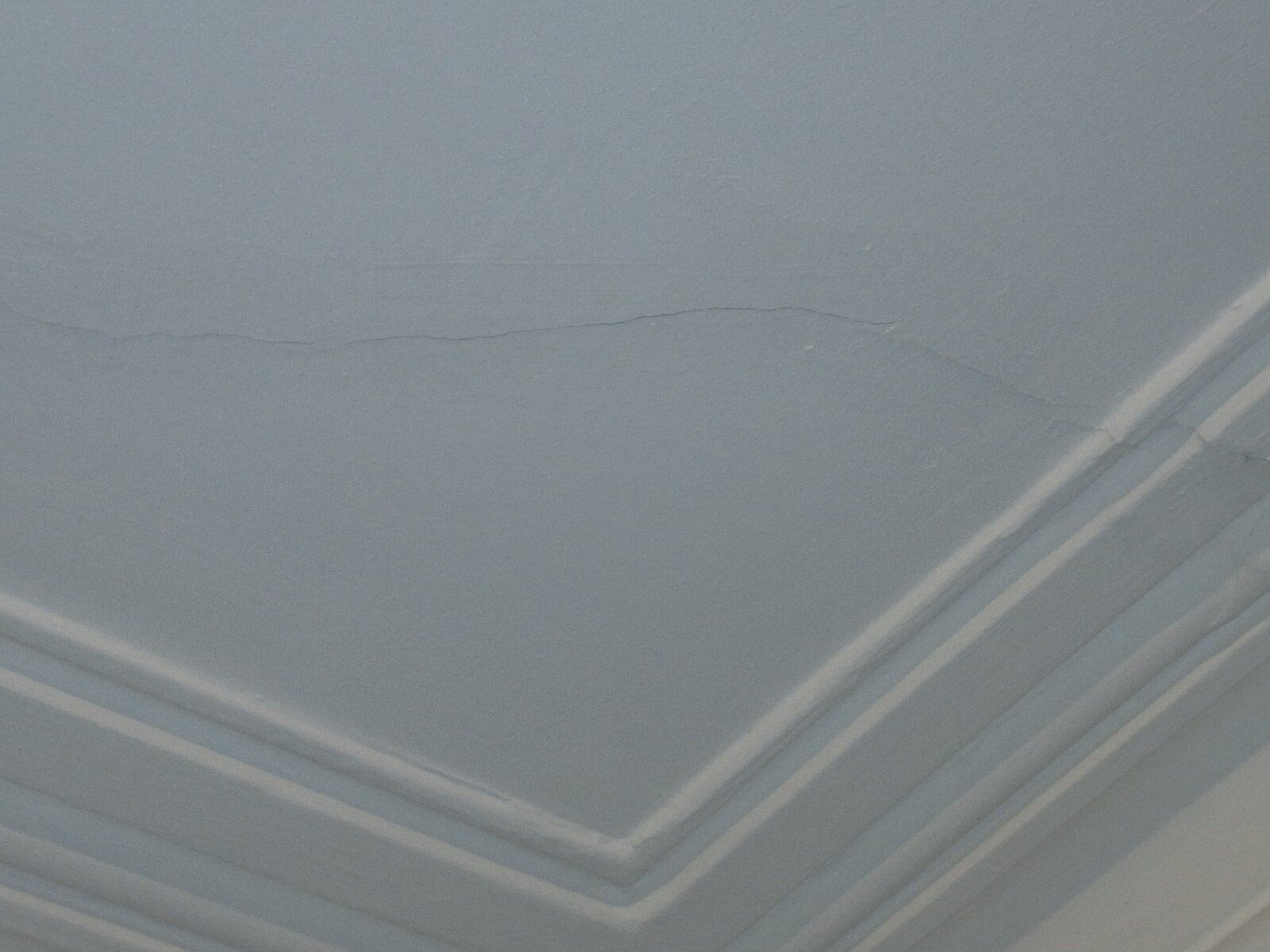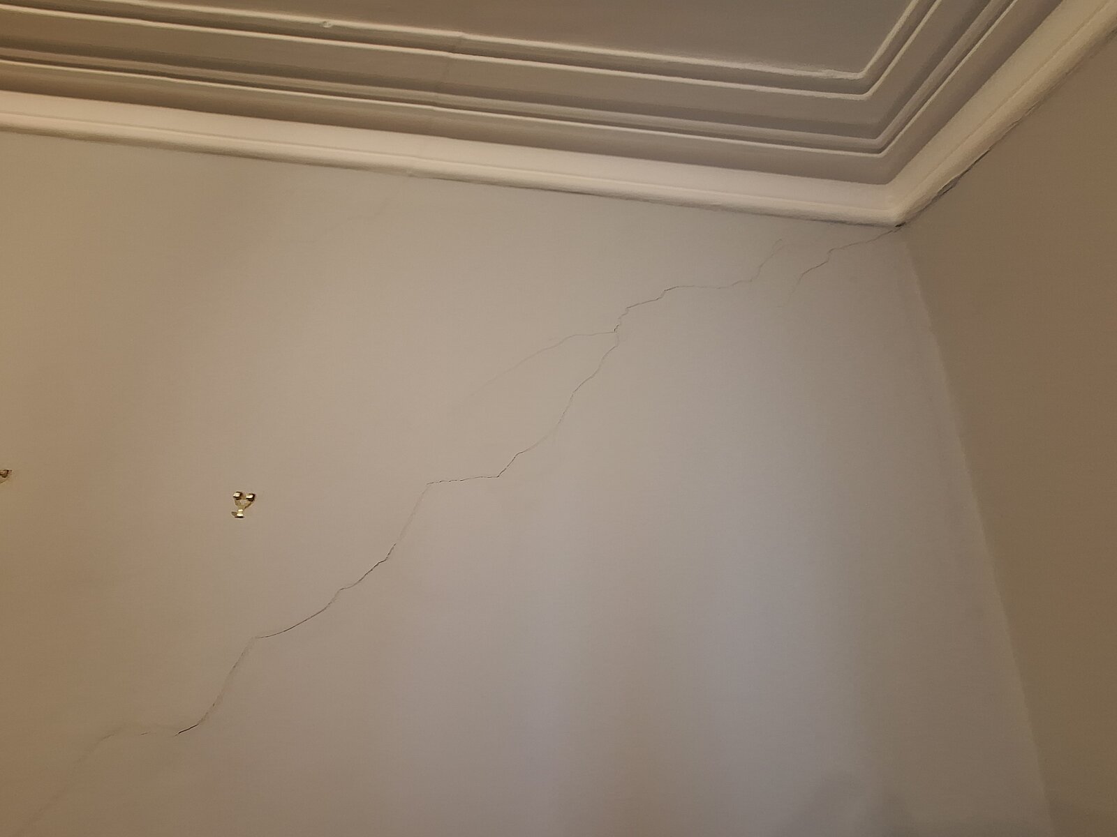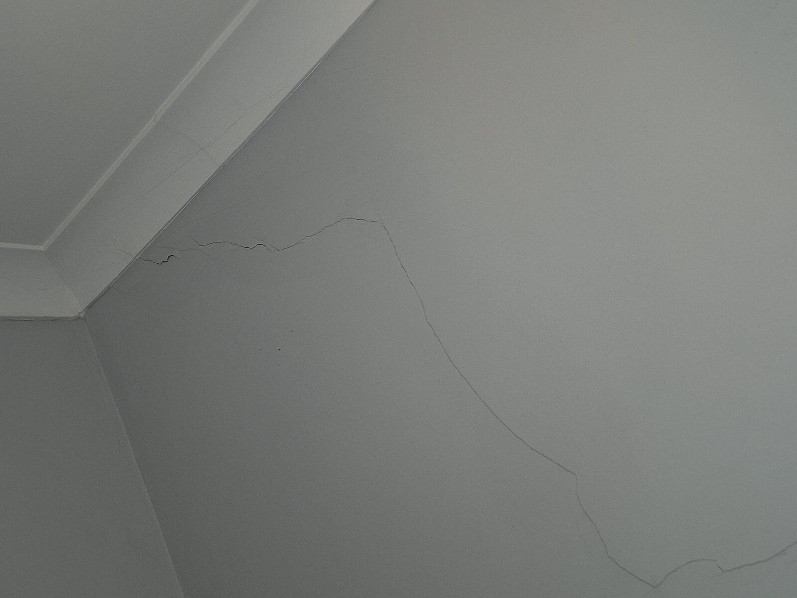 On the orher side of First wall there is a long diagonal crack mirroring First crack also with loose sounding plaster in places.