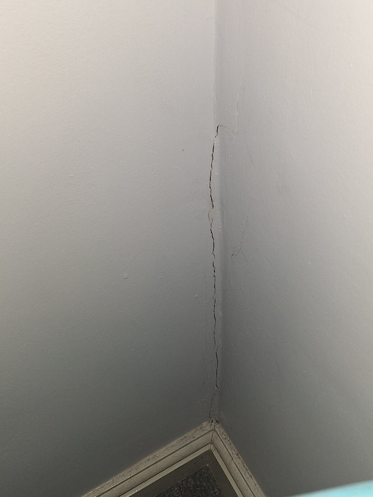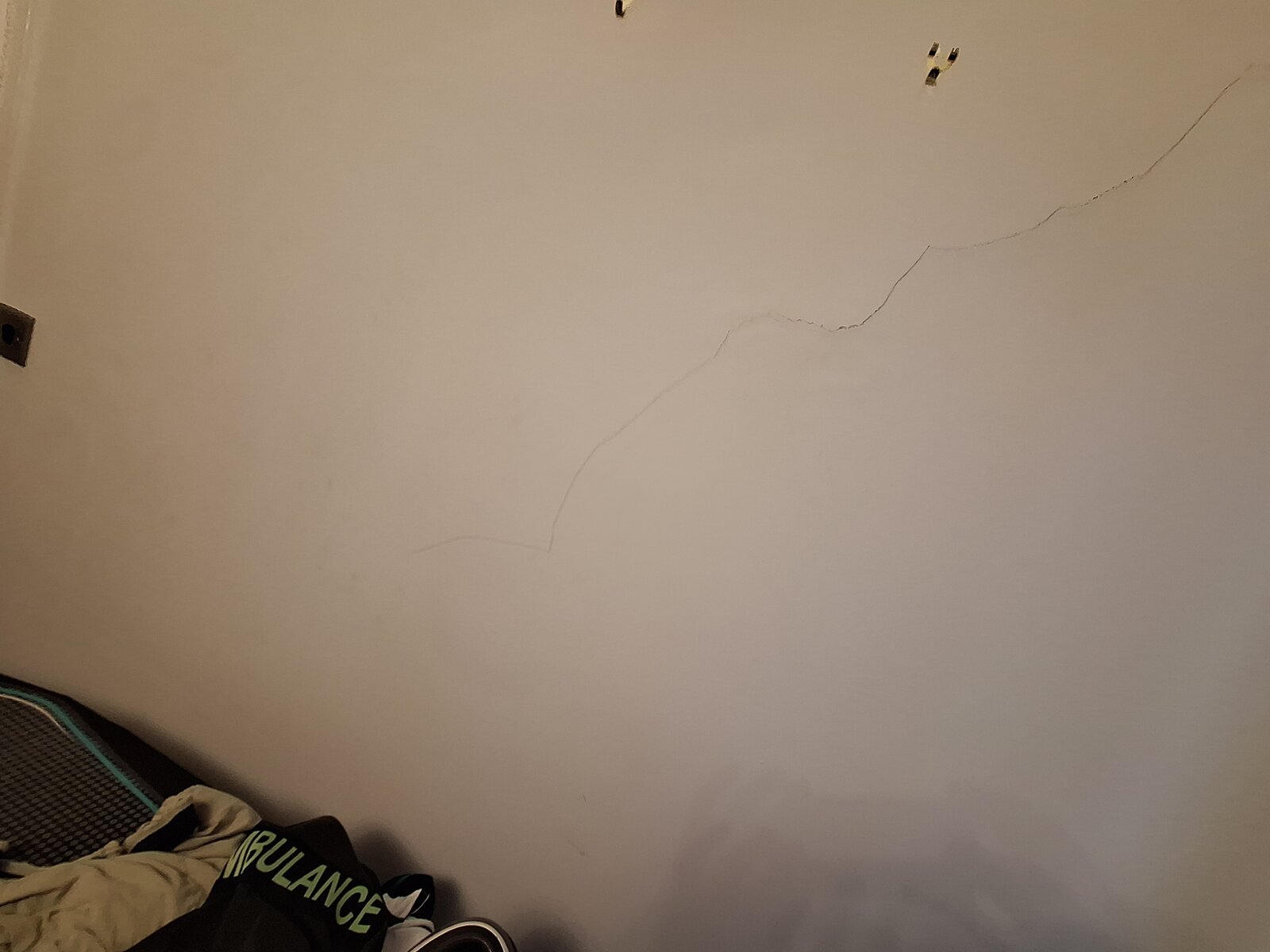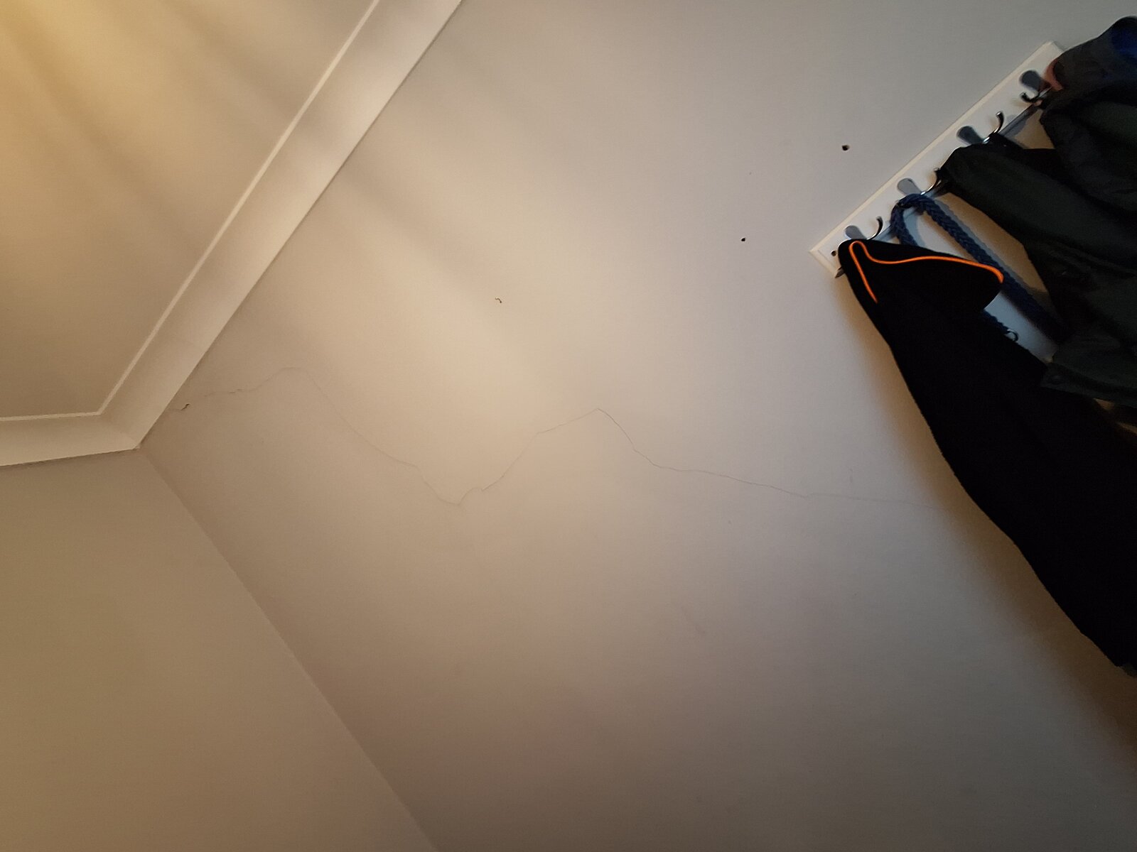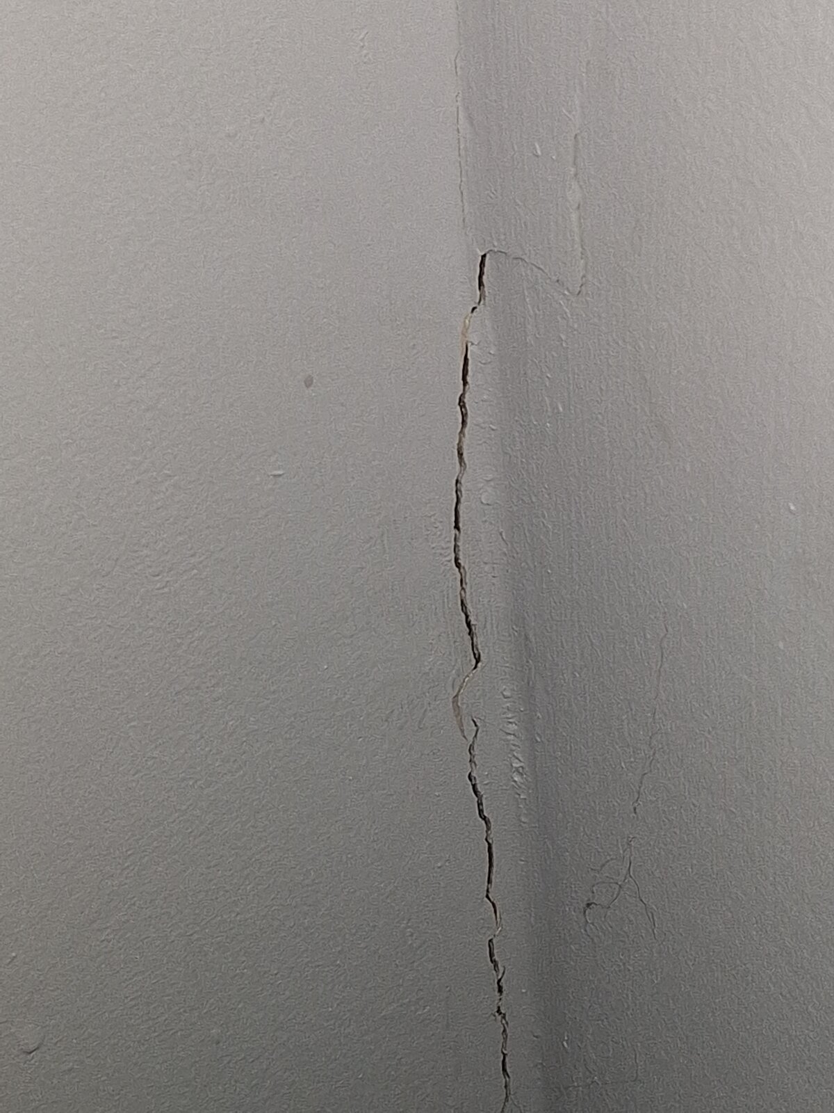 On the orher side of First wall there is a long diagonal crack mirroring First crack also with loose sounding plaster in places.
