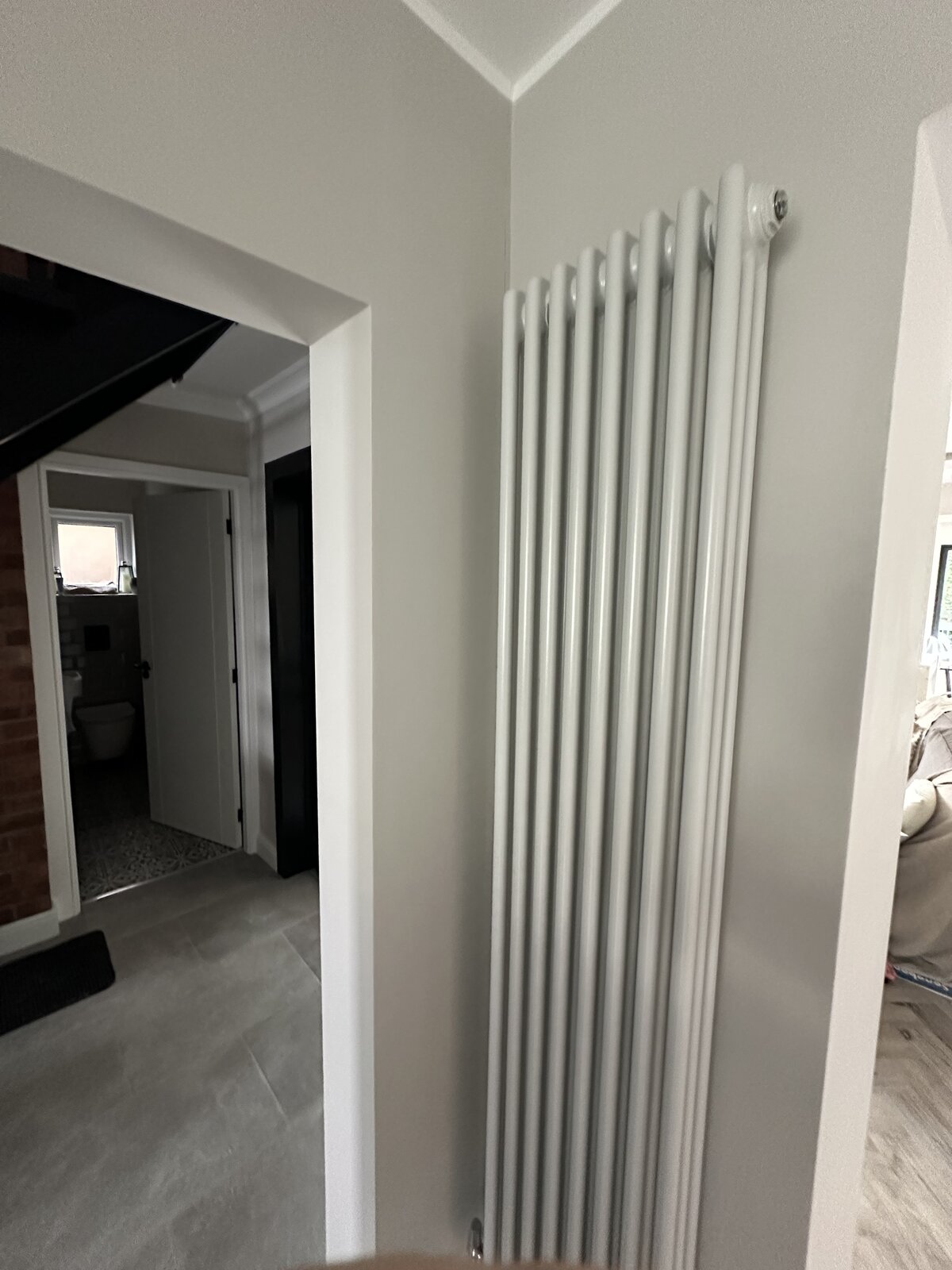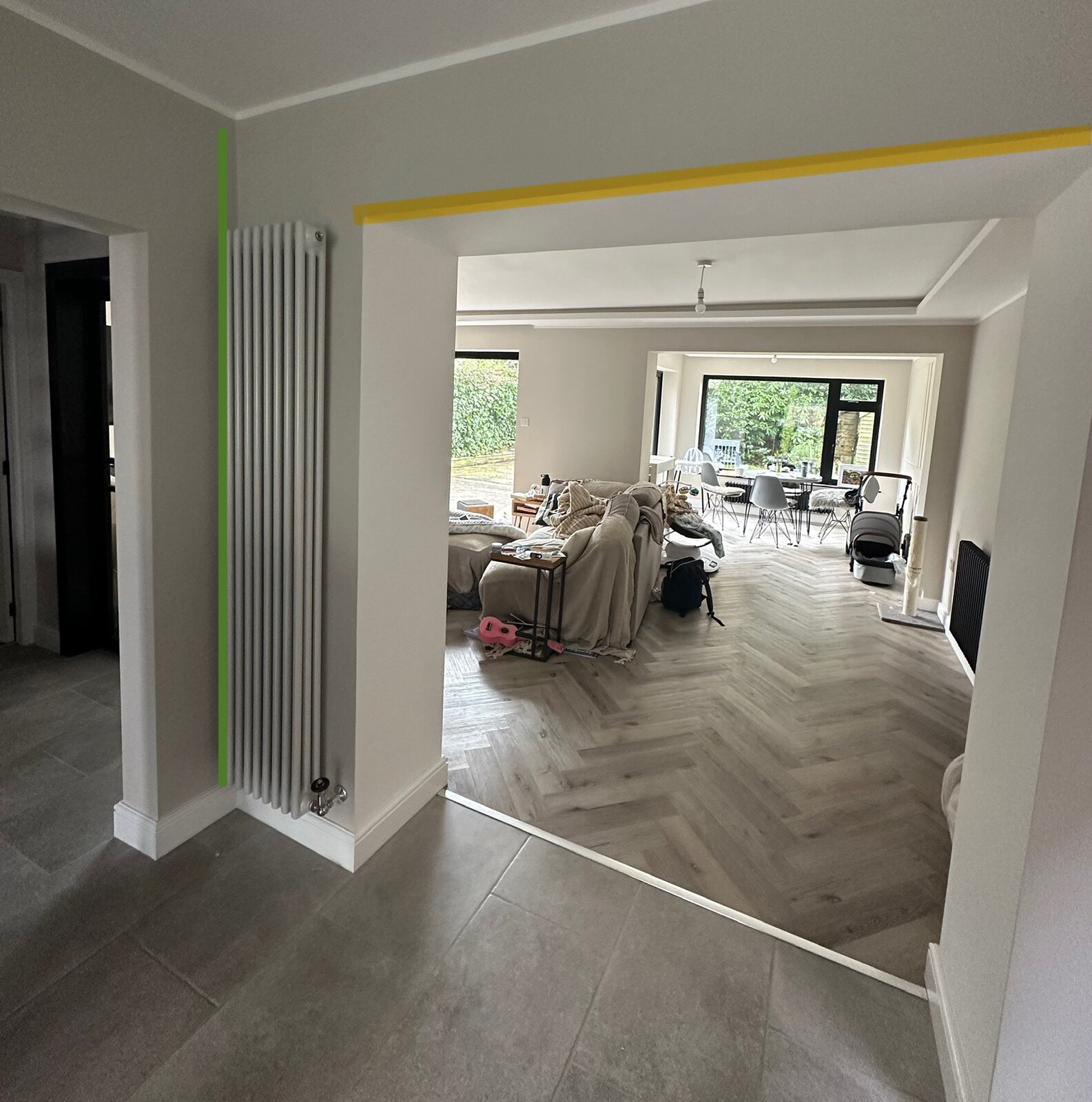 There’s a big crack in the corner by the radiator, which looks quite deep (marked with green). It’s on the wall only and goes from the ceiling down to the skirting board.