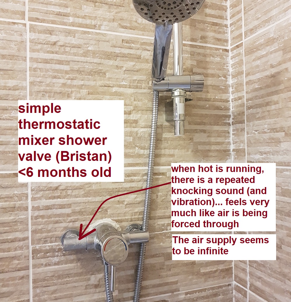 (2) There is very strong evidence that the shower is pulling in air and I think this must be the root of the problem. As I turn the shower from cold to hot, the valve will vibrate a bit and create a knocking sound, as though air is being forced through.