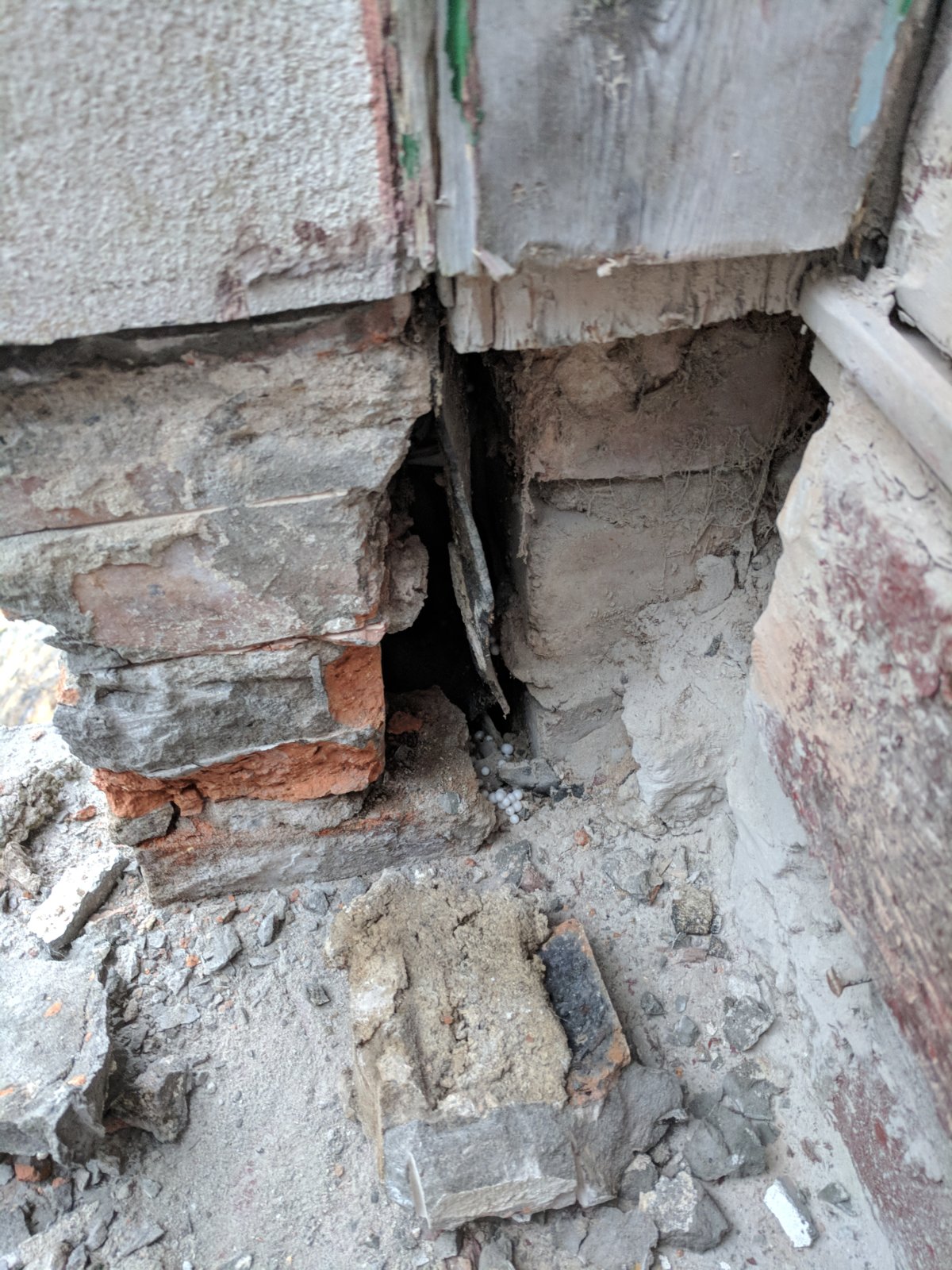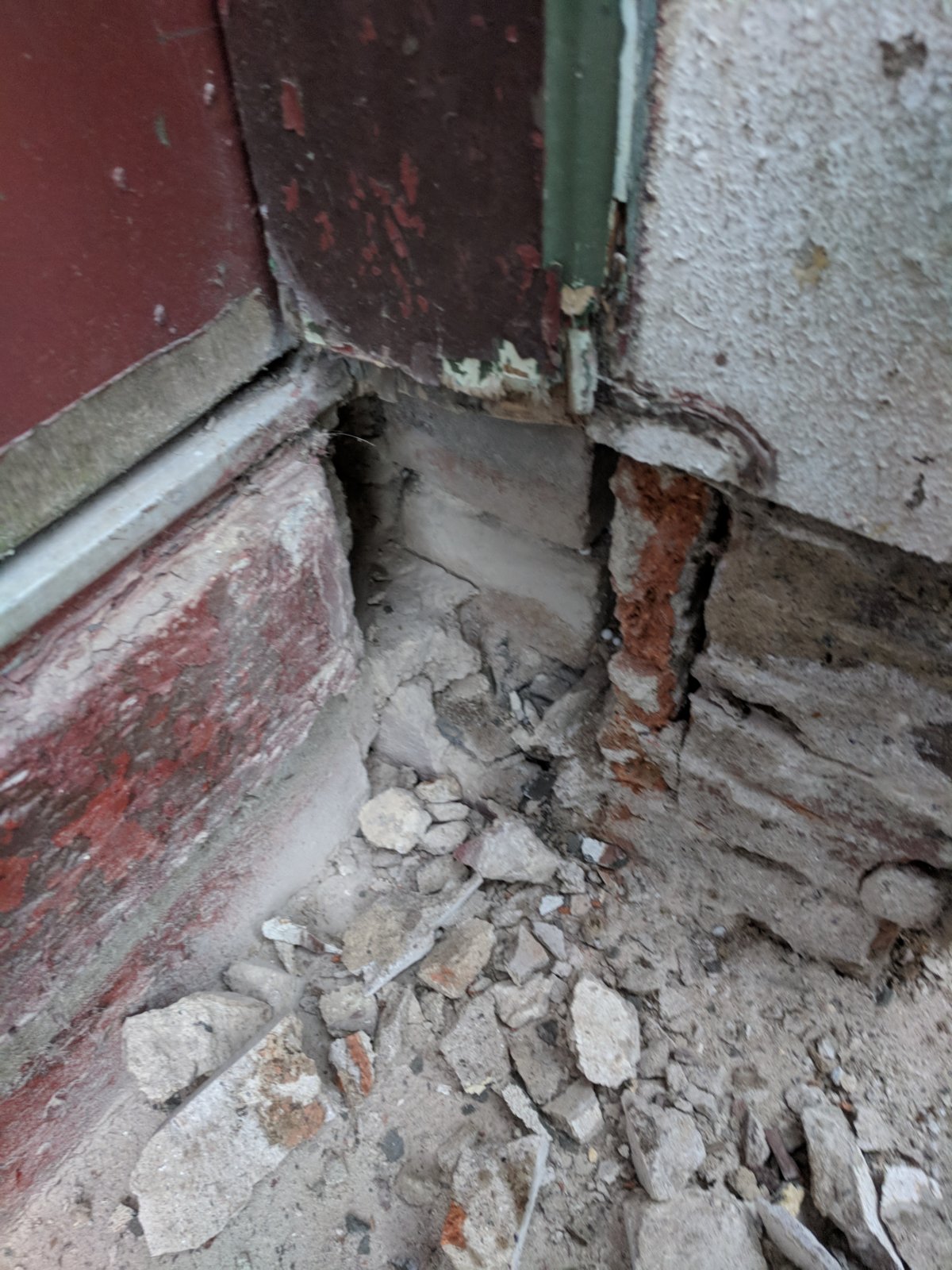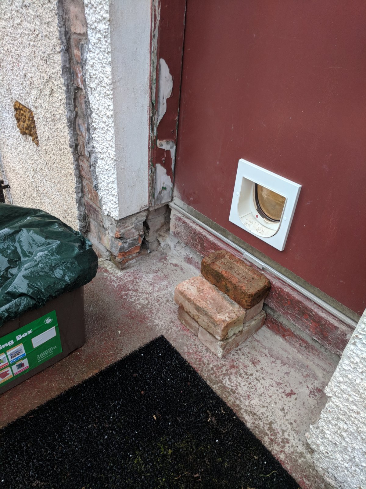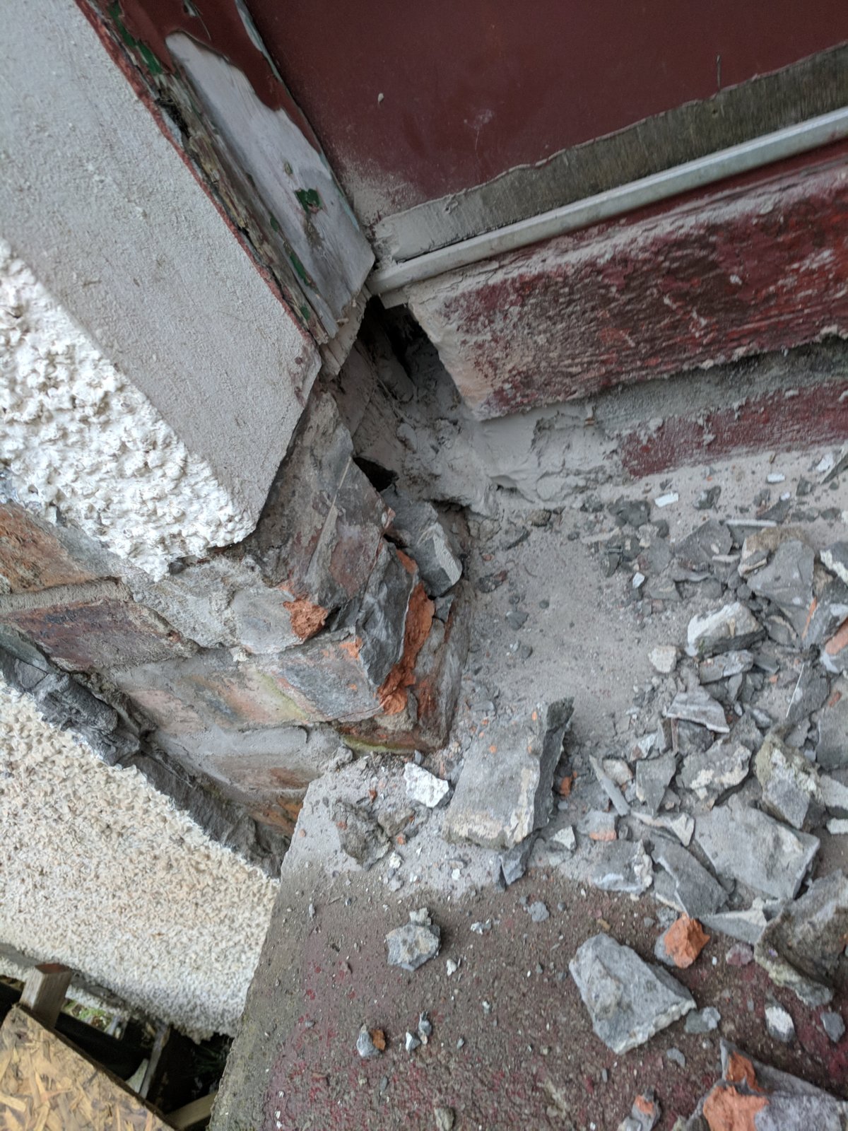 Long story short, the slab for our kitchen floor has been thickened at some point for reasons I don't fully understand. This left a tall step right at the edge of the door threshold bar. The door frame legs went down below the depth of the slab, overlapping the slab and the reveal. Ive now cut away the unnecesary sections of the door frame which had rotted at the bottom and removed the render at the bottom of the reveals. We basically want to create a step at the same level as the internal floor. Would it be fine to just make a form the same height as the internal floor level, flush with the outside wall and fill with concrete? Or would I be better doing it with brickwork. The damp course is about midway up the step height so not 100% sure about how to keep a dsmp course within the step, or if it's even necessary as the ground is about 4-5ft down.