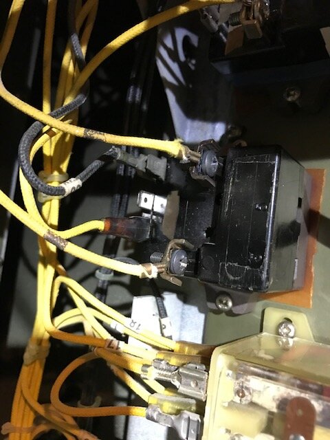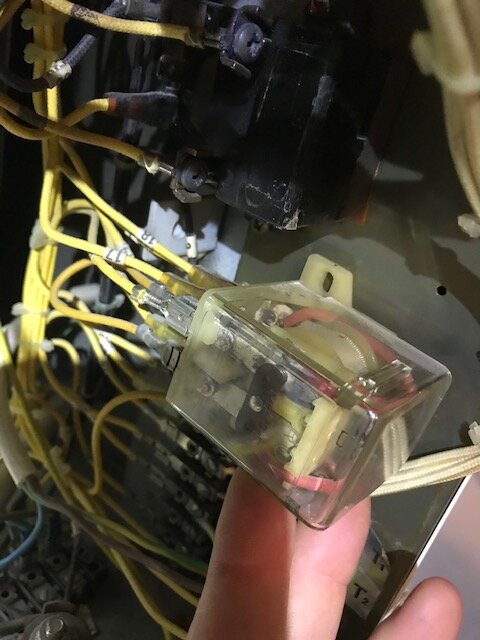 My son has a flat in Bournemouth which is heated by a Creda Comfortaire system. This is a large (12kw) centrally located storage heater type system with duct work leading to each room. It heats up overnight using the Economy 7 tariff and the heat is controlled during the day via a thermostat which controls the fan. He is now having trouble with it as it does not appear to be heating up over night. This seems like the wrong way around but it does make perfect sense, the high current feed which feeds the heating elements has a rating of 50A and is fed from the 24 hr supply. The much lower current circuit is from the off peak only supply. This is effectively a control circuit. So, the 50A supply is on and available all the time, the lower current circuit is coming on over night as it should be. I can test during the day by connecting the low current 'control' circuit to a 24 supply using an extension lead. So, when I apply power to the control circuit, I can hear the relay click and can detect 240v across the output of the relay, above the relay is a thermal relay. The thermal relay has four terminals. I think that two of these are a live an neutral which get fed from the relay when the off peak supply is energised. The other two terminals are for the switching function of the thermal relay as one permanently has 240v on it. What is strange is that the terminal that is the live that heats up the bi-metal strip for the thermal relay only has 240v on it about a minute after the off-peak supply is connected. When it does have 240v on it, I can see the electric meter wizzing around so I know that it is then working. However, a minute or so later, the 240v that heats up the bi-metal strip drops to zero. This indicates to me that the thermal relay is working fine which is a relief as a replacement is around £150. So, I guess it could be the relay but not easy to test this as the wires are 50+ years old and I don't want to mess with the relay too much. There is another small component above the power and thermal relays but it's quite difficult to get to and I'm not sure what it is. I've added pictures of the power relay and thermal relays.