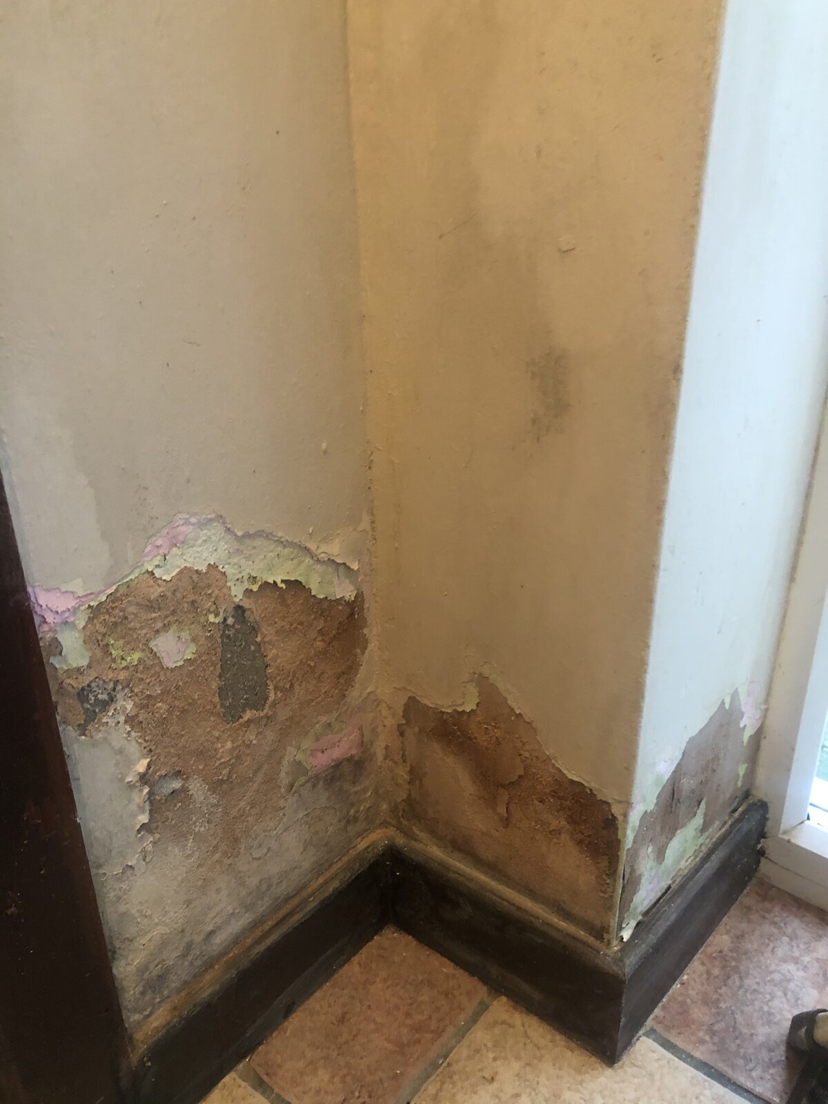 I would like some suggestions on what could be causing this issue on an extension wall built around 18 years ago - it has deteriorated after time but worsened over the past 3 years. Most of the black spot mould has just been cleaned in the photos, but it’s all over the walls pictured and the plaster has crumbled showing the brickwork on a patch of the wall. A tradesman suggested that the door needs to be resealed as there’s gaps, could this cause such damage?