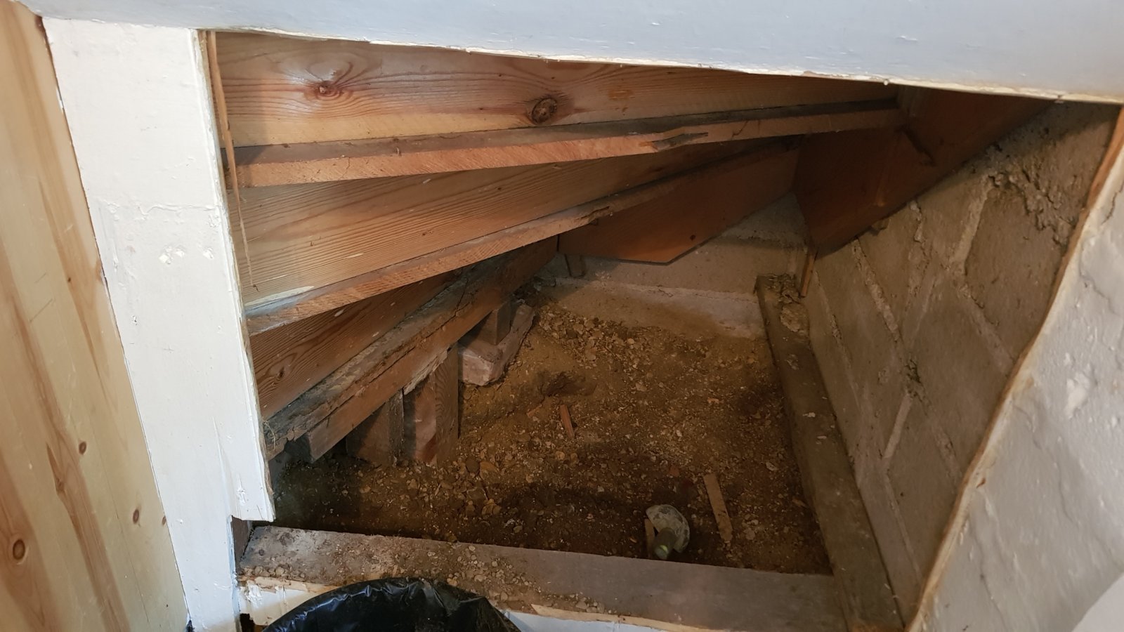 I want to build a cupboard under our old stairs. At the moment there is a small coat hanging area, but the far end is boarded over. I removed a board to see behind, the area where the stairs meet the ground is full of rubble and soil like stuff, some bricks and planks appear slightly structural. Do u think its OK to clean the area out and transform it? Pics to follow. Thsnks, Sam
