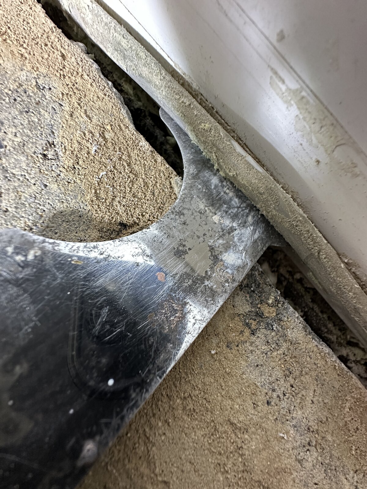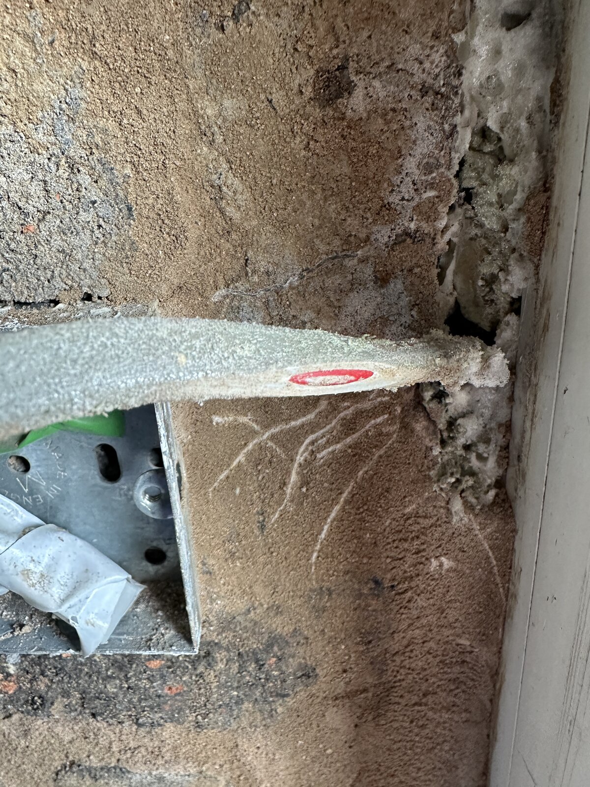 Not unless an electrical safe zone is stuffed between the upvc front door frame and the top layer of plaster? This is a 70+ year old house and the wiring is probably late 80s, so there are no zones that fit with today's regs, as far as I'm aware? Plug sockets are low to the floor, wiring is all the old colours, electricity meter is from the 70s, an old Feranti one that spins. As I said in the OP, the cable was just below the surface, mostly, with a very small amount, occasionally appearing for a few mm at a time, it had been painted many times over the years, had plaster on and more, so was well camouflaged, but the thing that got me, was that there was also a thick, bitumen type membrane in there, too, and I thought that I was trimming that.Was the cable in the electrical safe zone? If so, why did you cut in a safe zone where there are likley to be electrical cables?