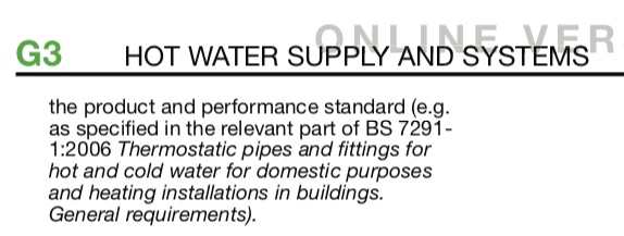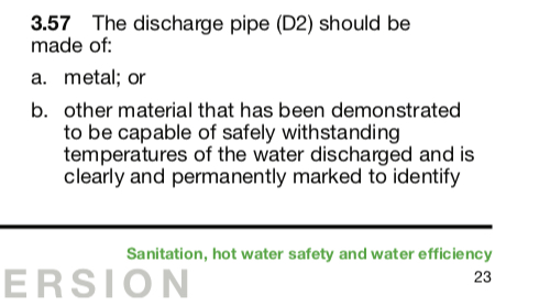 Hi there, we had an emergency plumber come round as flooring guy cut a pipe by mistake when laying flooring. During this time the emergency plumber mentioned our unvented water tank doesn't conform to building regs. He said the pipe coming from the water tank to the drain was a plastic one and it should be copper. I can't see anything in the regs about this. Does anyone know what he may be talking about?