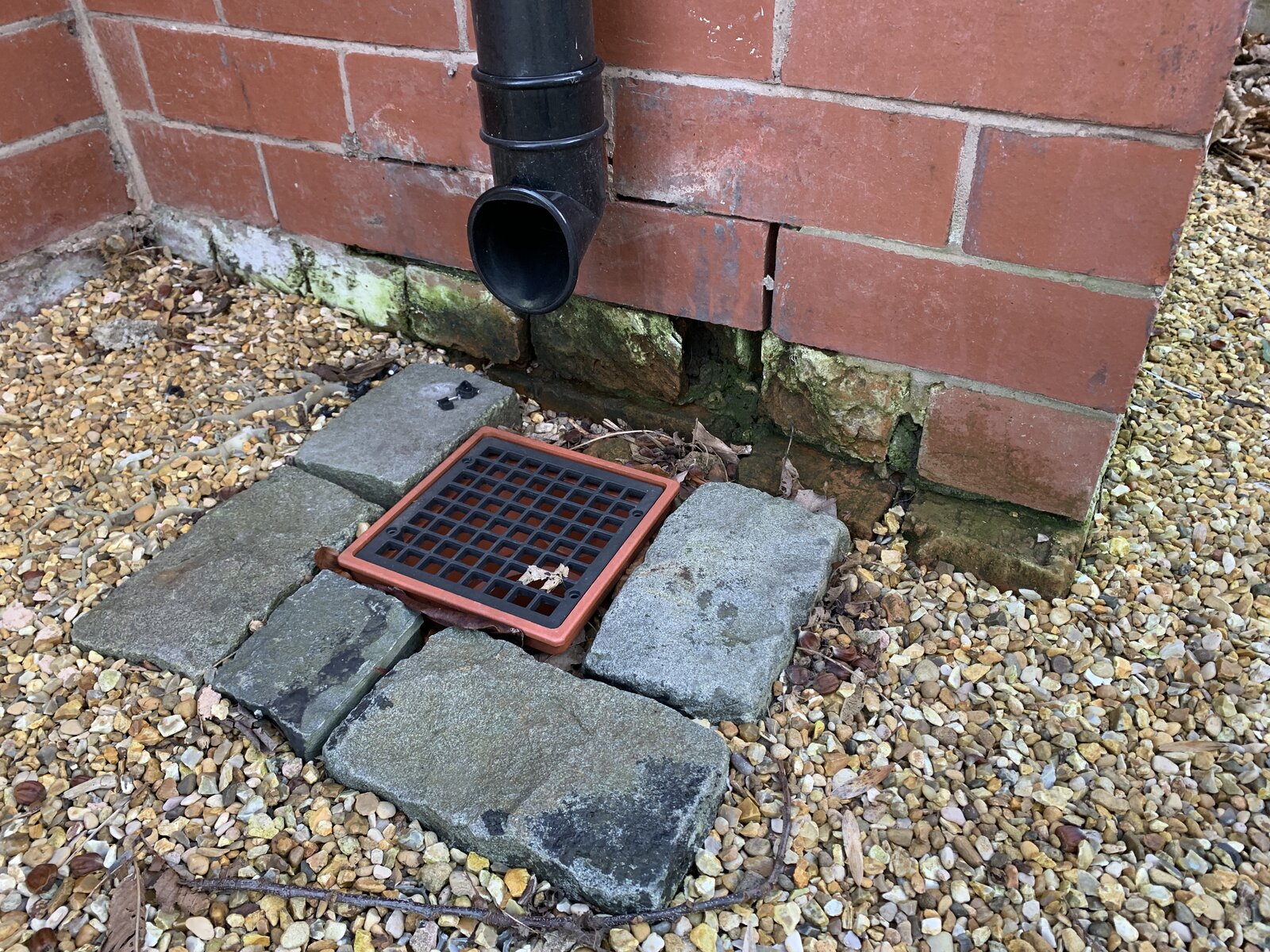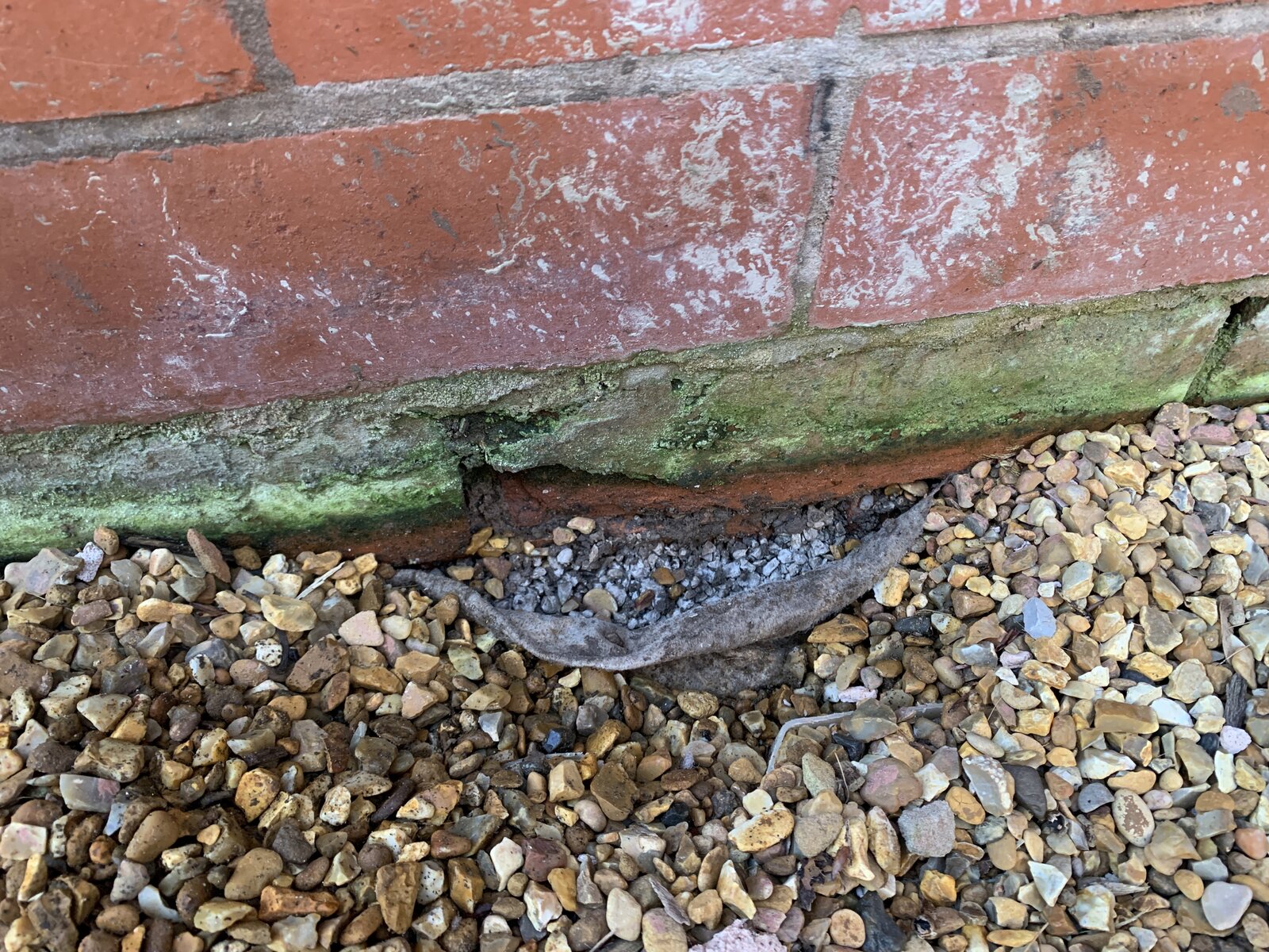 We have a gravel driveway that runs right up to the edge of the house. The course of bricks up against the gravel looks like it's been damaged by damp holding against it, especially badly near the bottom of a drainpipe. On digging a little, the gravel seems to be in two layers, a small grey stone, then a layer of felt, then the top layer of yellow stones.