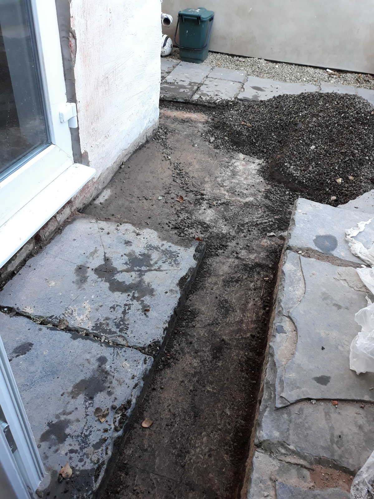 My dilemma is should I still dig out the patio infill and get some DPM in between floor and outer brick regardless. Worried if I can't overlap the original I'll have moisture popping up elsewhere. I also have a sunken gas pipe about 4-5 inches from the affected area so worried about disturbing but really dont want anymore builders in.