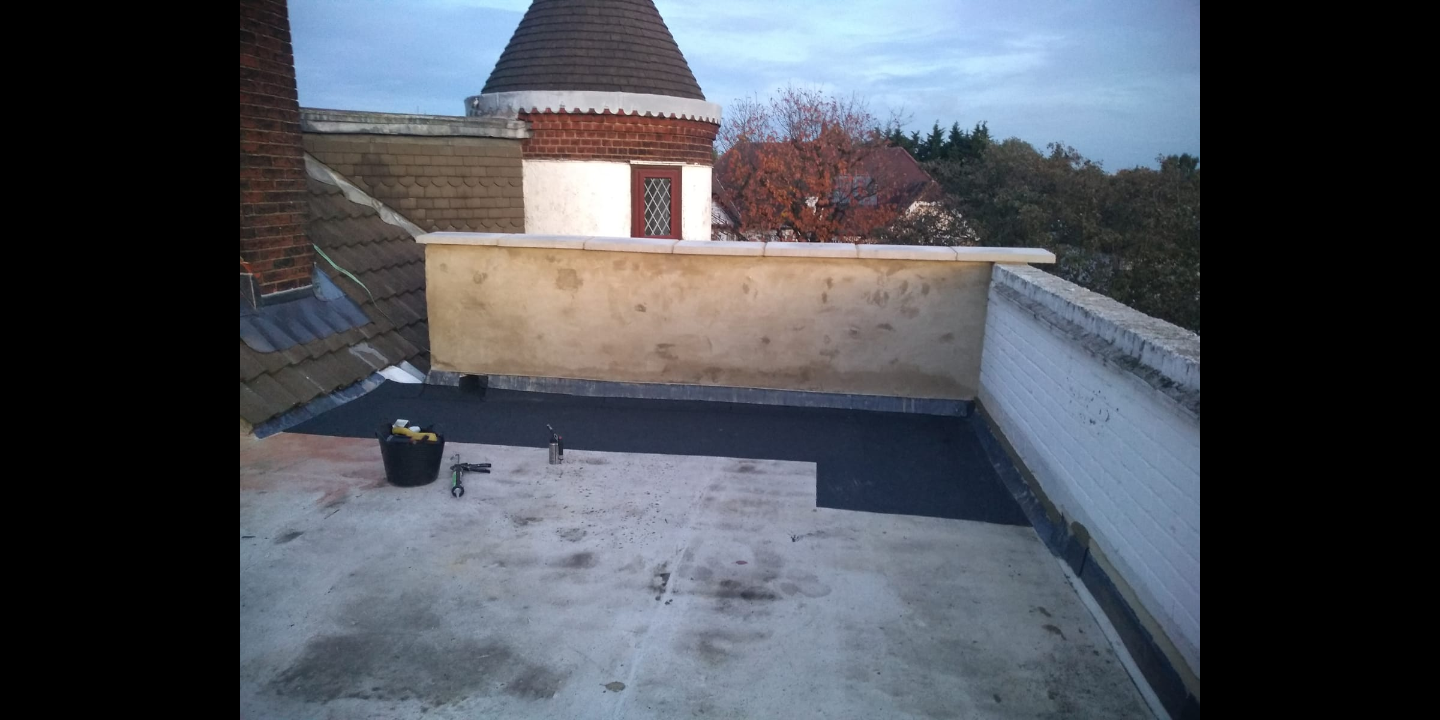 After this was repaired, we continued to get the damp patches, although the direct water streaming down the internal wall ceased. To try and resolve the issue damp patch issue, new coping stones were added to the affected wall and the face of this wall was also rendered. The flat roof at the junction of the asphalt upstand and wall was treated with torched on felt.