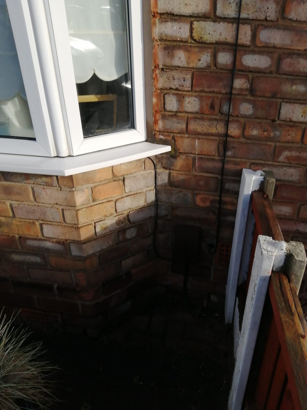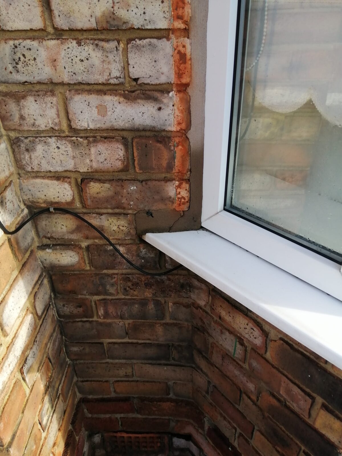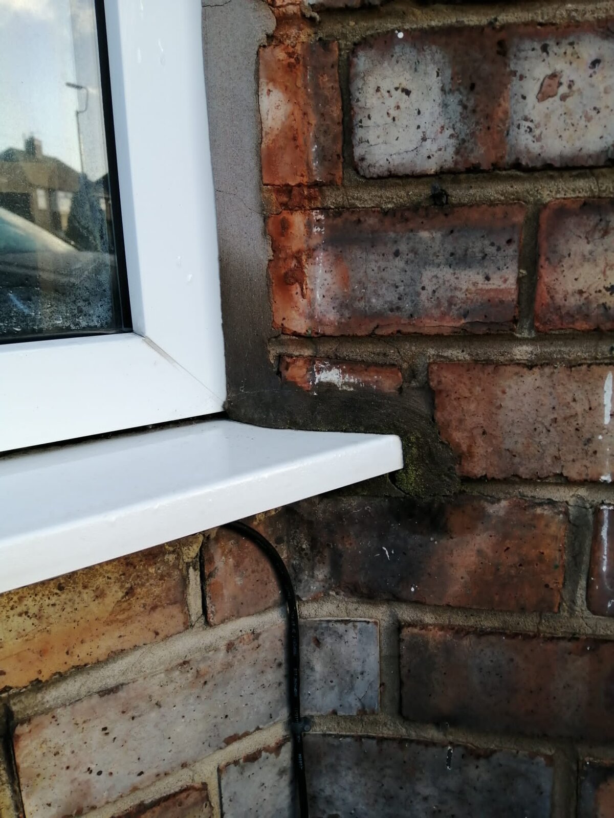 Looks to me like it's probably water ingress from around window or failed pointing but I'm no expert.