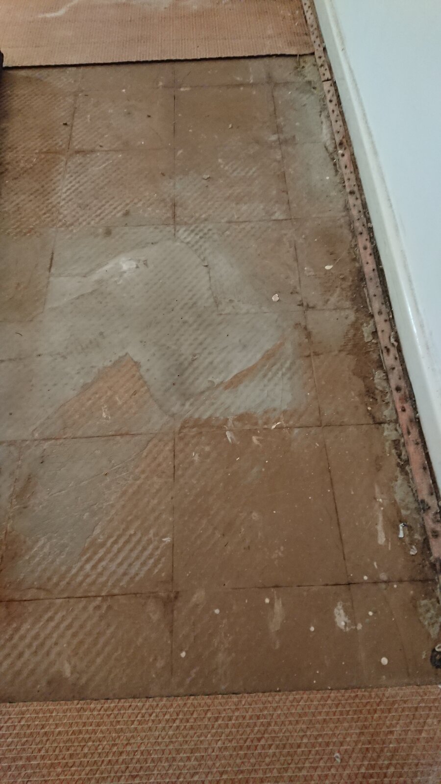 Taking the carpet up shows this. The gripper is badly rusted and the underlay has rotted where there is damage to the hard lino tiles.
