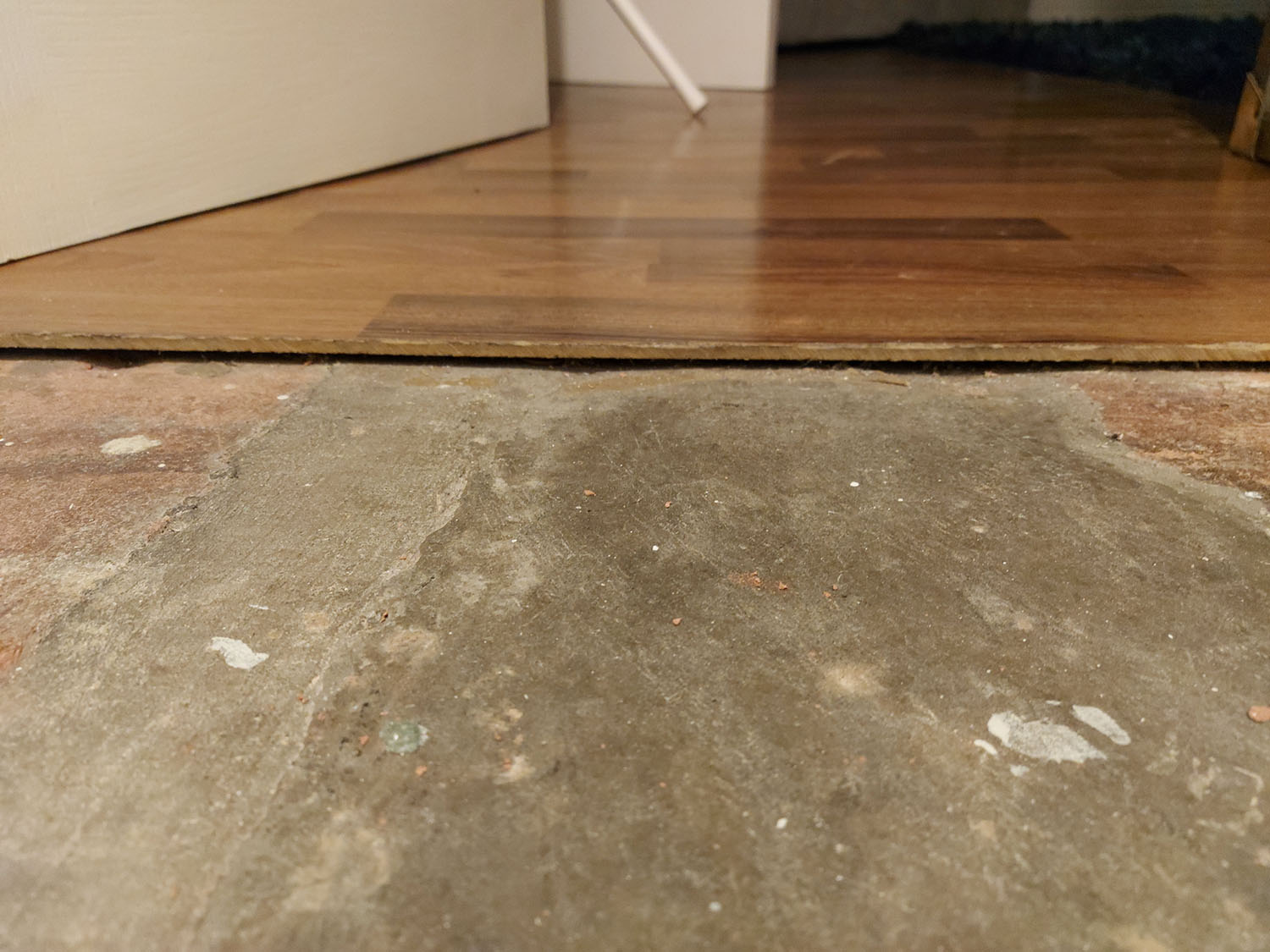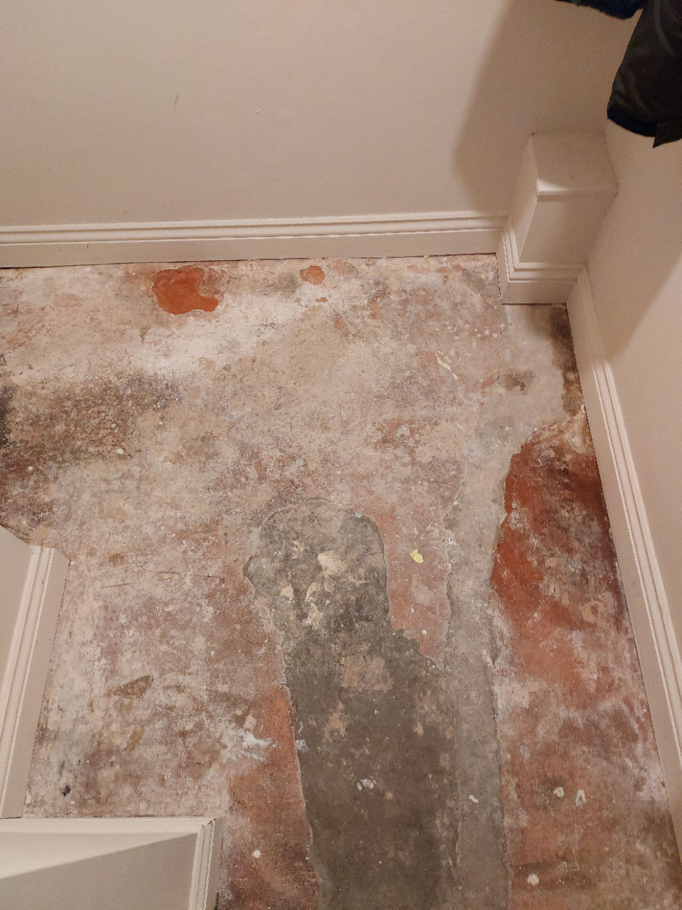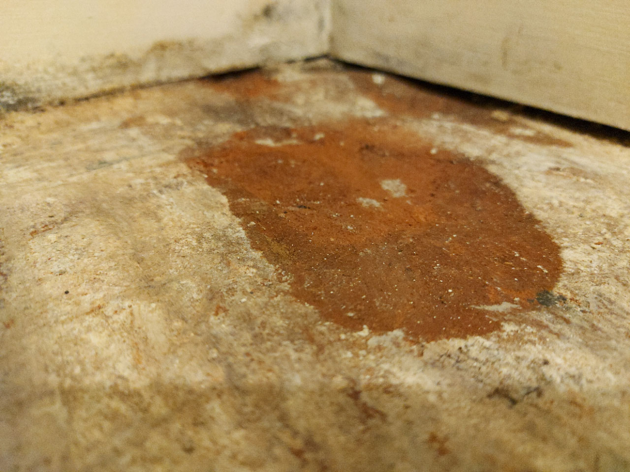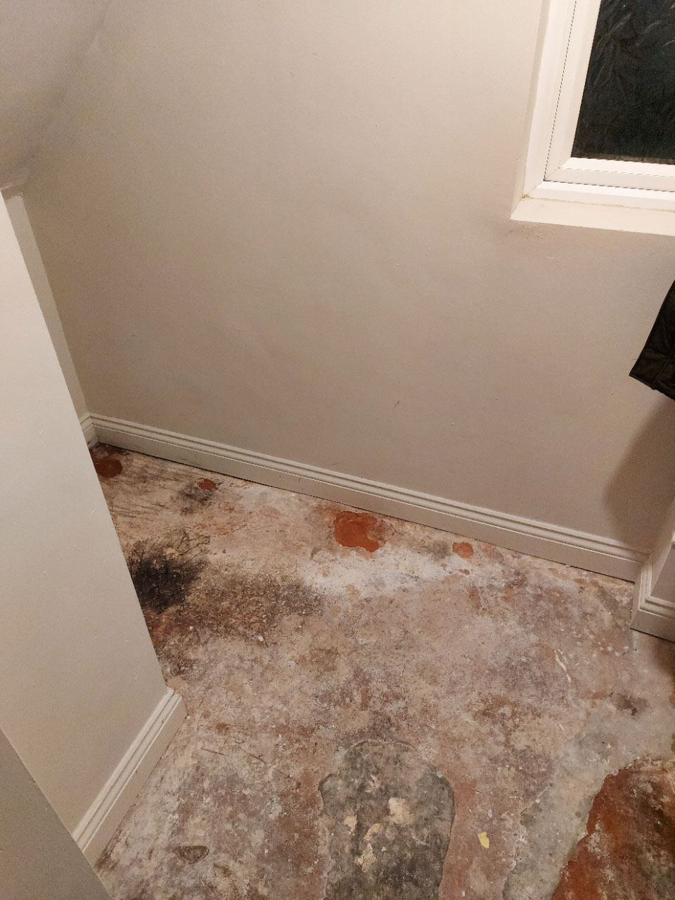 Until recently, the floor was covered with carpet. When I removed it, because I am considering tiling it, I realised that the floor is not in a great state (uneven surface and crumbling in parts). Furthermore, it smelled of damp and the top eft corner of the room felt wet (it is where most of the rainfall hits on the other side).