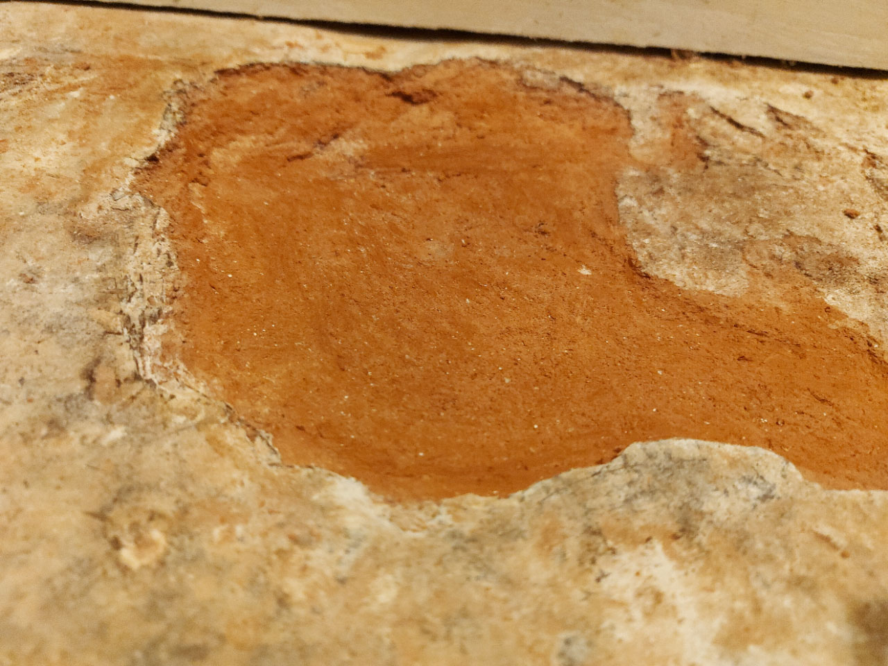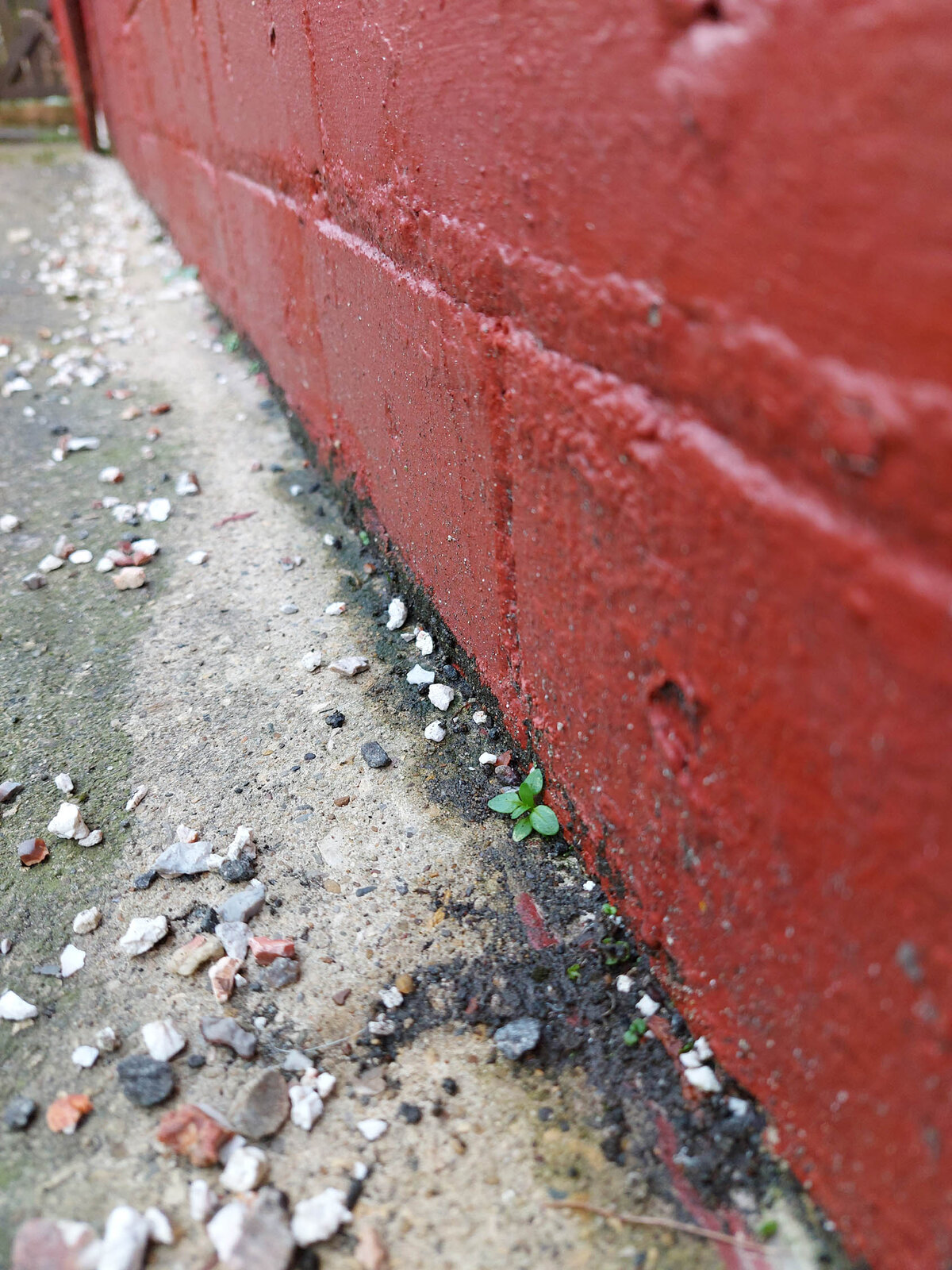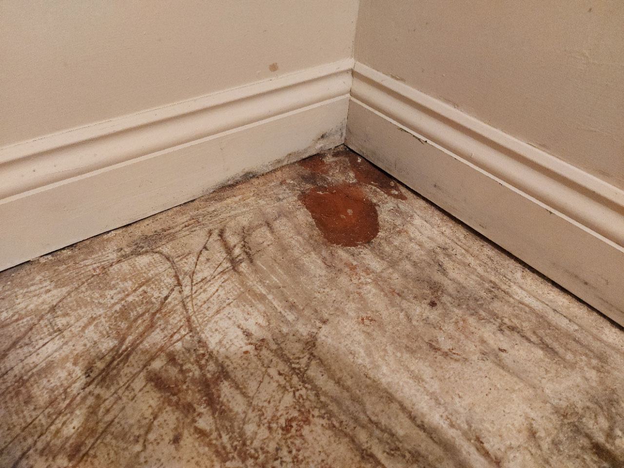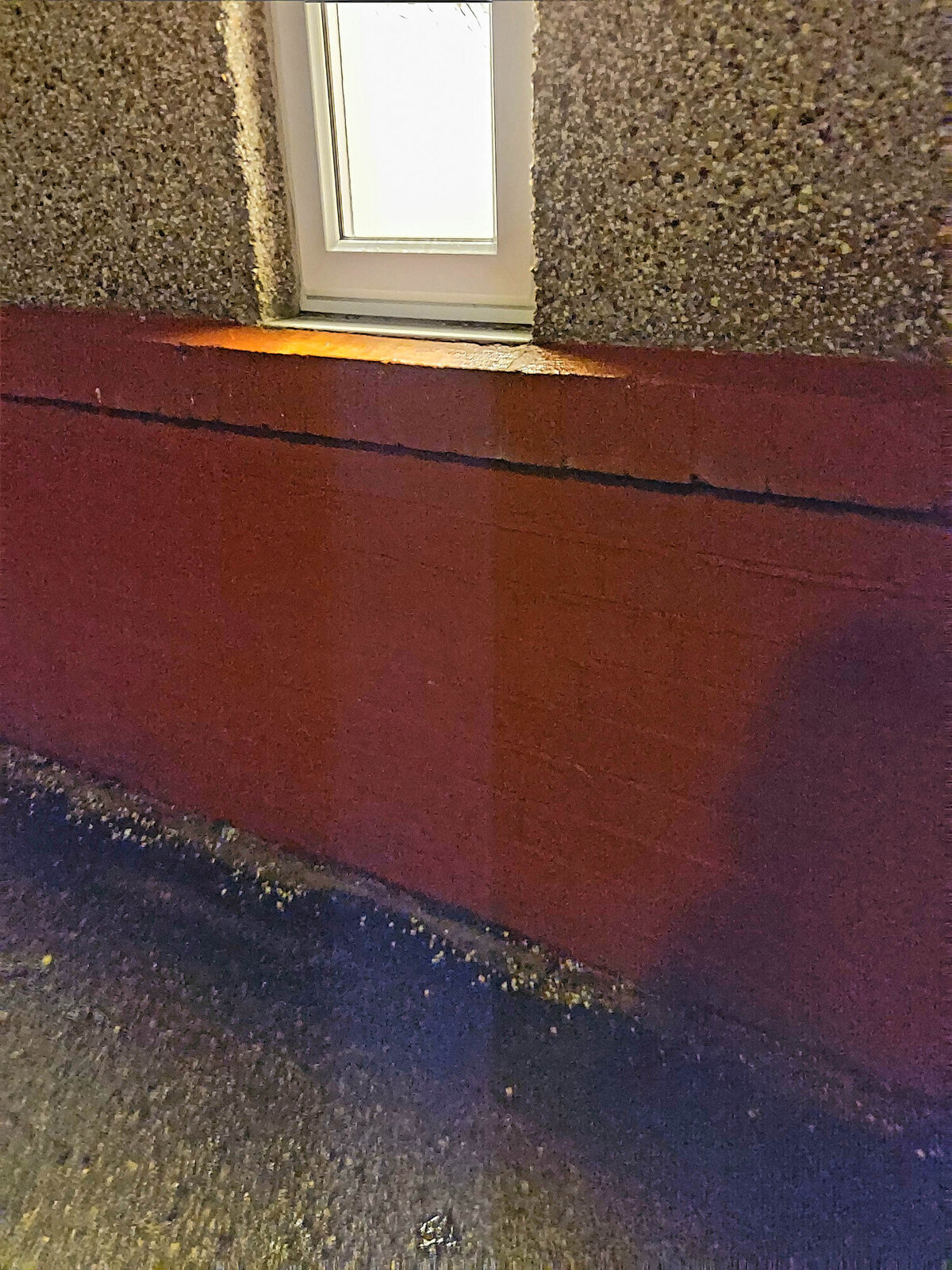 Until recently, the floor was covered with carpet. When I removed it, because I am considering tiling it, I realised that the floor is not in a great state (uneven surface and crumbling in parts). Furthermore, it smelled of damp and the top eft corner of the room felt wet (it is where most of the rainfall hits on the other side).