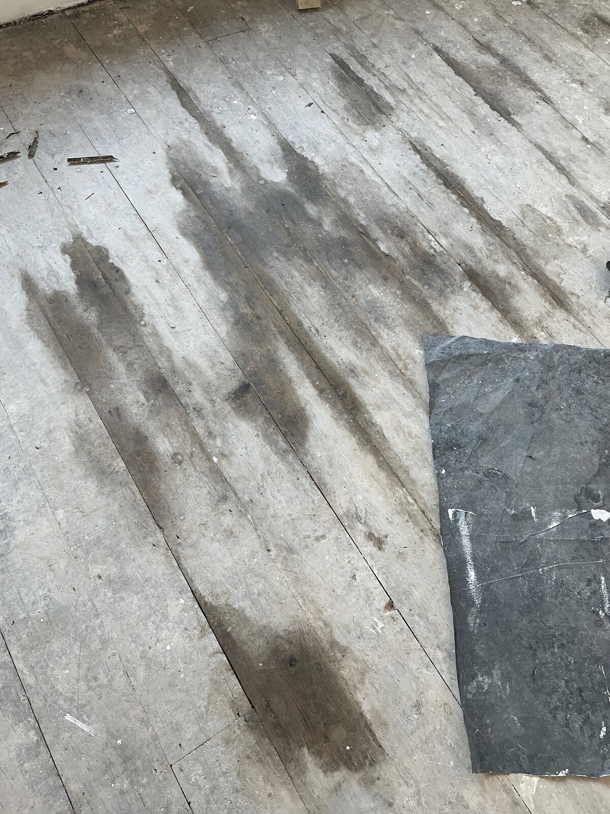 We purchased a house in August and have been renovating since. We took up all the old floorings and as it rained/got colder damp patches appeared on the floor in one bedroom. It has not appeared any where else. We had a damp specialist out as we had taken the floorboards up and they are dry underneath and there are no pipes running underneath. This was also confirmed by our plumber. The specialist advised we need to fix some slates on the roof and cap the chimney. We have done this and heated the room to dry out, but it has returned? There is a strange smell to it and it feels oily. Has anybody had this before? Any advice would be much appreciated. I have attached pics of it before, dried out and then when it’s come back.
